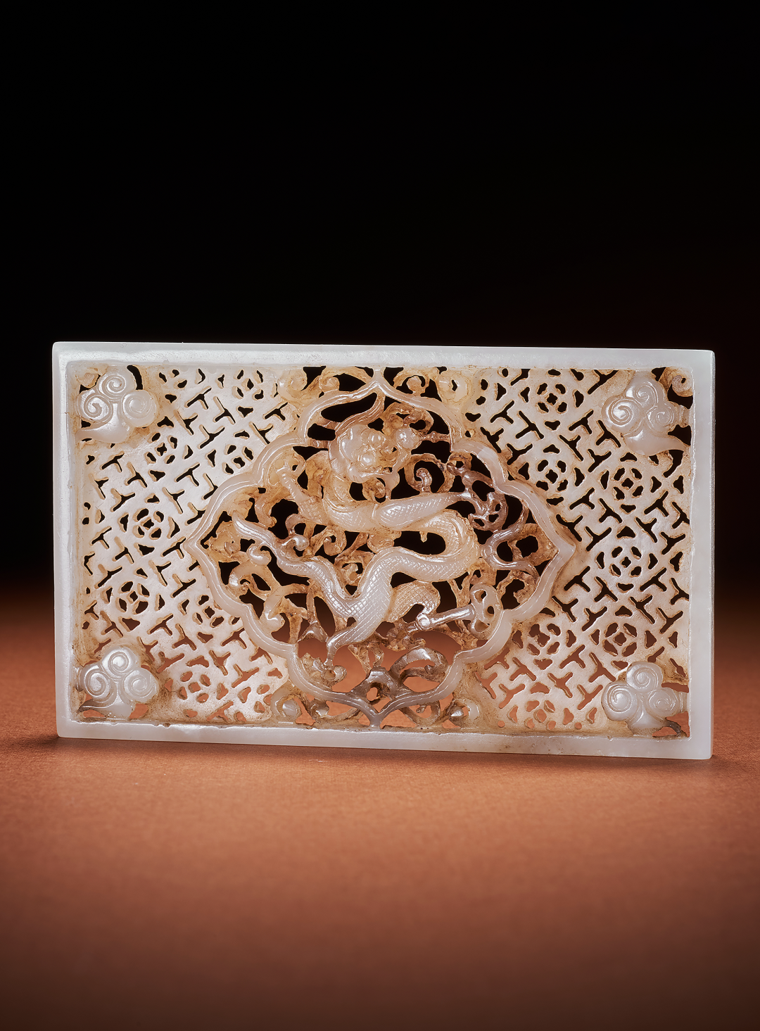 带板白玉雕琢,玉质润泽细腻,色若膏脂,呈长方扁平形。带板正中镂雕龙纹,龙形体细长,圆眼长鼻,张口见齿,毛发向上冲起,四足腾空,身姿矫健,呼之欲出,气宇轩昂。四周满饰万字纹,带板四角雕琢如意云纹,寓意吉祥。整器图画细腻华美,雕工精细有力,纹饰经典,典雅悦目。布局严谨,比例协调,边缘修饰细腻,尽显高超技艺。