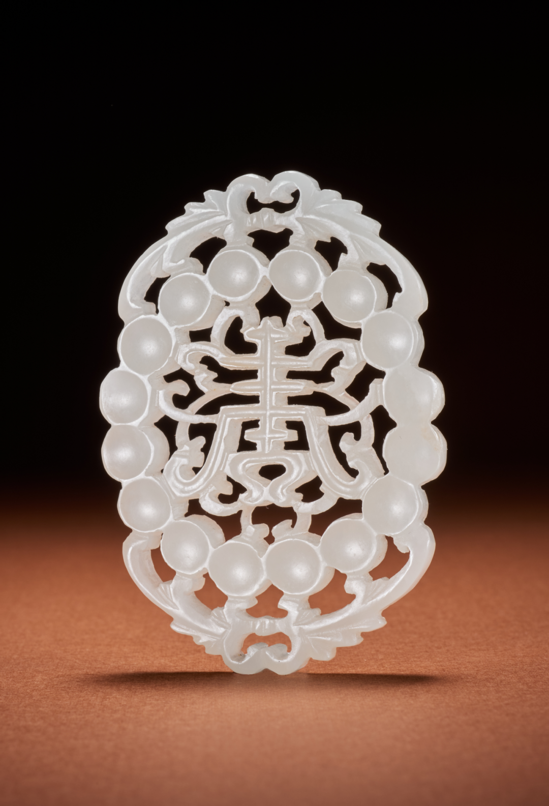 此件玉佩白玉为材,玉质白皙润泽,刻工流畅精美,玉佩中心镂空雕琢寿字纹,寿字纹四周雕琢一圈连珠纹,佩首尾雕刻对称花草纹,生动自然,设计精巧,刀法娴熟,刀工犀利,工巧意佳。