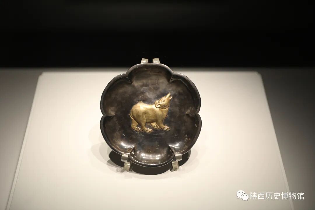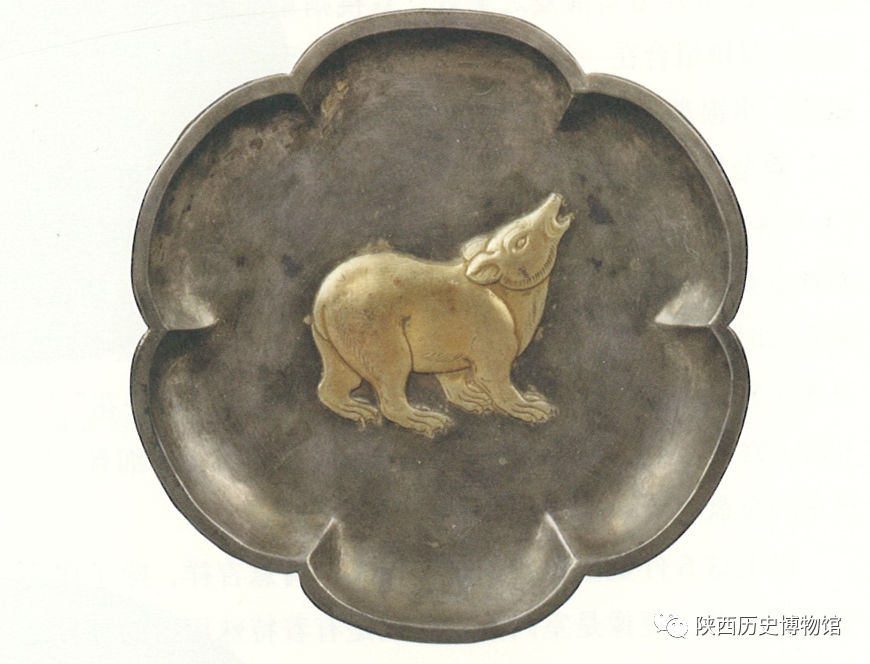 鎏金熊纹银盘:盘底中心装饰一只经鎏金处理的熊。中国古代,熊代表力量,《淮南子·兵略训》 中有:“虎豹便捷,熊罴多力”,故多以熊作器物承重之足;熊也是生命力的象征,故有宜男之寓意,传说女子若梦中有熊,就是生子的预兆,《诗经·小雅·斯干》中就有“维熊维罴,男子之祥”。“七姨”是唐中宗韦后的妹妹,她十分迷信,专门作豹头枕以辟邪,作白泽枕以去魅,作伏熊枕以宜男。