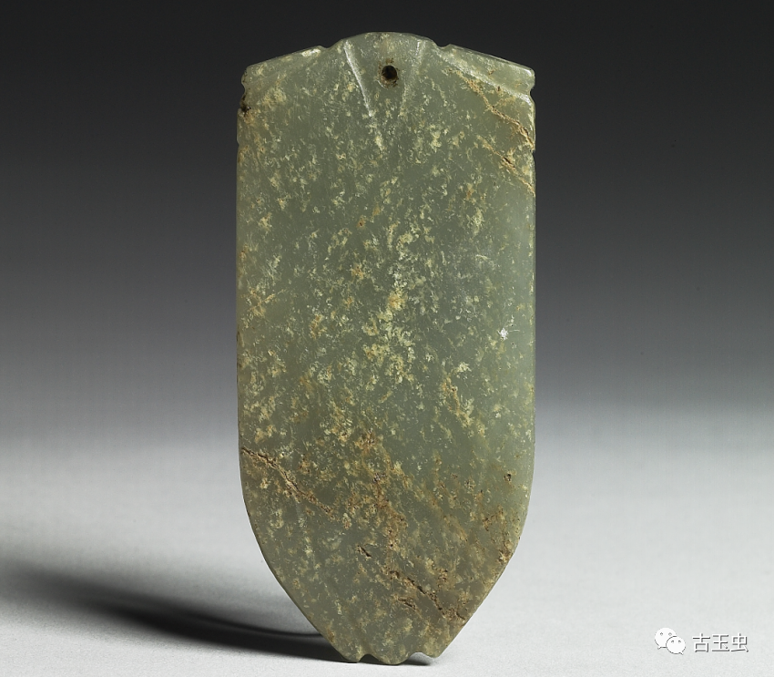 商周玉蝉用于日常佩戴,形制古朴,雕刻粗放。所用玉材质地欠佳,多为半石质。蝉头眼大,身翼窄小成细长倒梯形;头部中央有孔,用来穿绳。蝉身用简单的阴线刻象征身体部位。