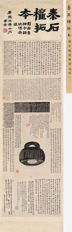 谷卿(1987- ),安徽安庆人,文学博士,中国艺术研究院中国文化研究所副研究员。主要从事古典文学与艺术史的研究和教学,关注近世学人思想与学术流变。近著有《唐宋词心解》《书画印艺的象与神》等。在一般印象中,晚清政治人物郑孝胥(1860—1938)似乎和“金石”并无密切关联,他未尝在此“道咸以后日益盛”[1]的学术领域留下著述,人们也很少从佳拓善本中看到他以题跋发表高见。不过,作为近世最负盛名的书家之一,郑孝胥确凿是“碑学”的拥趸,他一贯强调应由汉碑及南北朝碑中汲养,对汉隶的推崇无以复加,认为习学楷书和草书也必该借重隶书[2];作为“同光体”诗家中最具成就和影响的代表,郑孝胥亦时常应请品题金石器物、碑帖墨拓之类,以诗人角色保持着和金石收藏家及学者的交往。值得提及的是,郑孝胥在书法方面终身奉行的最重要的主张和实践“隶楷相参”,最早就出现于他为《瘗鹤铭》拓本题写的诗中,所谓“君谟老眼有微言,指出隋贤参楷隶。隶楷相参转出奇,谁将此意试求之”[3]。从这些角度考量,郑孝胥并非绝缘于金石,虽未“深度介入”,毕竟“若离若即”,正像他在光绪二十二年(1886)建成濠堂之际自设答问:“壁间复何有?旧拓兼新诗”[4],作为郑孝胥日常生活背景的“拓”和“诗”,两者间亦存在互动,而其各类金石题咏之作正是此一互动的终果与呈现。据传存的拓本题跋原物来看,凡郑孝胥有所留迹,多数时候似乎仅见寥寥数字观款,且每写于不起眼处,这似乎和他自负矜傲的性格与形象不符。事实则是,若论以韵语咏赏,郑孝胥则绝不省啬笔墨,必得于同题诸家中出一头地,如他曾在光绪二十七年(1901)应端方(1861—1911)之请,为其当岁新获之秦石铜权初拓本题诗,云:开皇穿地证量器,隗状或作林者非。