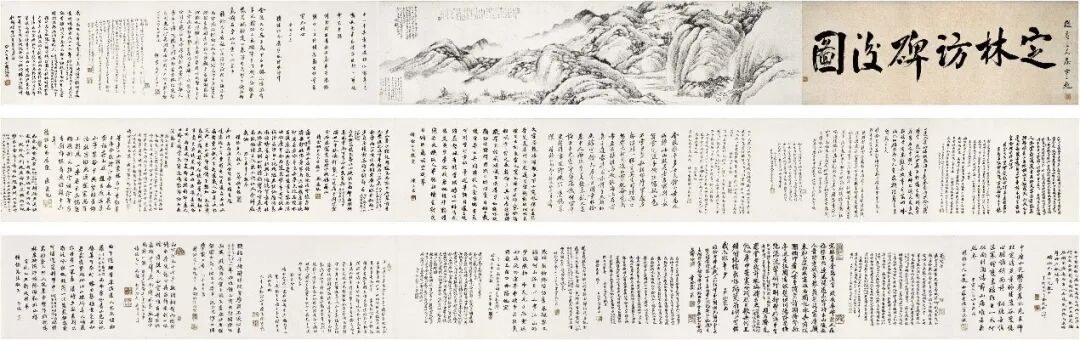 晚明以前,零星可见学者入山访碑的记录,及至清代乾嘉之世,此风臻于极盛。金石家视访碑为殊具风雅的文化实践和更新知识的重要途径,既为游赏活动增色,又能校证、补苴文献的疏漏讹误;而在访碑行为之后图写“访碑图”,则兼备记录、纪念、传播和塑造形象、建立认同、引领风尚等功用,这类图画也往往结合了实景山水和抒情山水的特色。郑孝胥此诗前八句似全以定林访碑旧事为依托,实则“承平”二字已埋下伏笔,至第九句诗意陡转,由此反观十六年前后之变,在其意念与叙述中便是自“兴”而“亡”。“山灵脱命才几希”一句仿佛仍言画中事物,至后二句索性说破:“名流狼狈鸟兽散,海上存者真孑遗”,极见怅惶沉痛。本以为“当时图咏”能够流传久远,谁知未几即失其踪迹,欲“可久”却“转眼灰烬”,“空余悲”者,又岂止失画之事而已。多年以后再图前事,当时参与访碑题咏的故交,已因世变而各具不同立场,在自居遗老、视“民国乃敌国”[20]的郑孝胥看来,等待那些“变节”者的必是“深讥”和恶谥。按题此长卷的二十余家,所署年款形式不尽相同,一般多用干支纪年;梁鼎芬、沈曾植、王潜三人仍落“宣统”年号;至于张謇,则是唯一写“民国二年”者——郑孝胥在感痛之余究竟讥刺何人,自然不言而喻。诗以“何年更往待事定,聊破寂寞镌岩隈”收结,看似平淡,实则劲甚,令人惊心,“事定”与前句“收拾”呼应,是知“收拾”绝非只谓重新作画题咏、寻挽旧忆或即从容遁隐,而另有所指,不妨与郑孝胥“莫道湖山终寂寞,遗民满卷足留传”[21]及“老夫未合称遗老,待拨江山反少康”[22]等句合观,其深旨可味。也许是老友们观新图伤旧国的情绪感染了徐乃昌,他遂对前曾题咏者提出要求,希望他们将当年所写诗词一并录诸《定林访碑后图》,或能为后人“观人论世”增一助益。民国七年(1918),郑孝胥以小字书前题二诗于卷后,其一《游定林观乾道题名》云:定林亦何有,惟有石嶕峣。