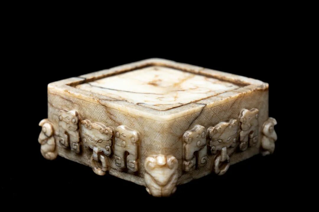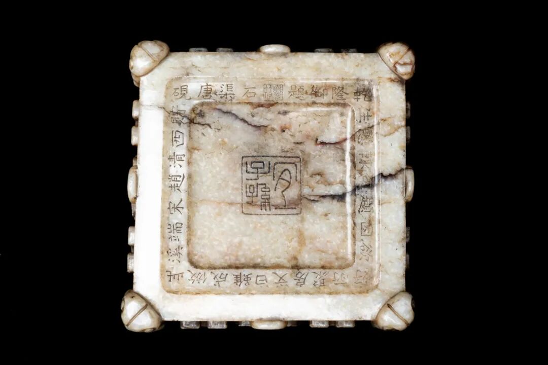 乾隆皇帝传承中国古代文人追古思幽的清趣传统,其审美心理具有浓重的「求师述古风」倾向。传世乾隆御制艺术品中有大量临摹古物器形纹理及风格的宫廷工艺作品,其中的玉器摹古品可谓旷世第一,历朝均没有如此的数量规模、材料等级和工艺质量的作品群,所谓前无古人,后无来者。本品形制特殊,极其罕见,采用上等和田玉制成,玉质温润细腻,莹润光洁,莹采肌滋,打磨极为细致,局部带有沁色,古色古香,韵味十足。器呈四方型,器口四周饰「回纹」,四周凹槽,中部凸起,器身四周满饰「锦地纹」,纹饰繁密而不乱,排列规矩,刻画清晰。四面皆采用浮雕手法饰「兽面衔环纹」、「夔龙纹」,威严肃静,神秘十足。底部阴刻「石渠唐砚贮西清赵宋端溪此仿成虽曰文房聚所好欲因题句辄惭生乾隆御题。」「宜子孙」「德充符」印章款识。字迹款识皆清晰,刀法老辣,力道十足。整器图案庄重,工艺极其精湛,繁而不乱,质地温润,为极其罕见的宫廷文房用具。