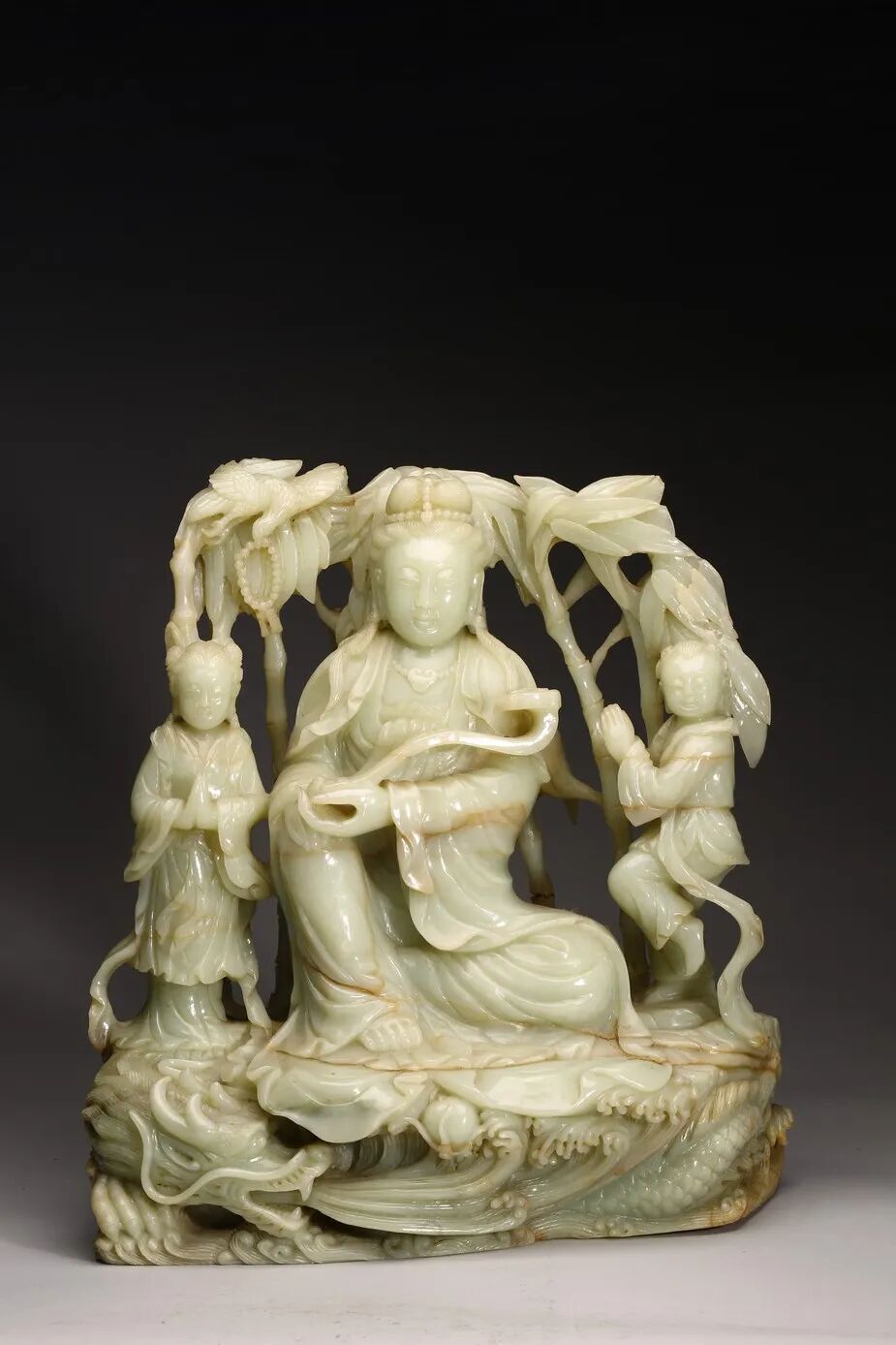 和田玉持如意观音坐像精心雕就,玉质细腻如凝脂,质地上乘,细致温润,用料硕大,观音开脸饱满,法相端严,束发髻,神态慈祥,五官刻画细腻,弯眉长目,身着天衣,衣纹处理流畅自然,双手持如意,呈自在坐姿于海水座之上,两侧童子呈拜观音姿势,活灵活现,整器纹饰精美细腻,刀法流利而精湛,极富表现力,展现匠人之高超技艺,极具收藏价值。