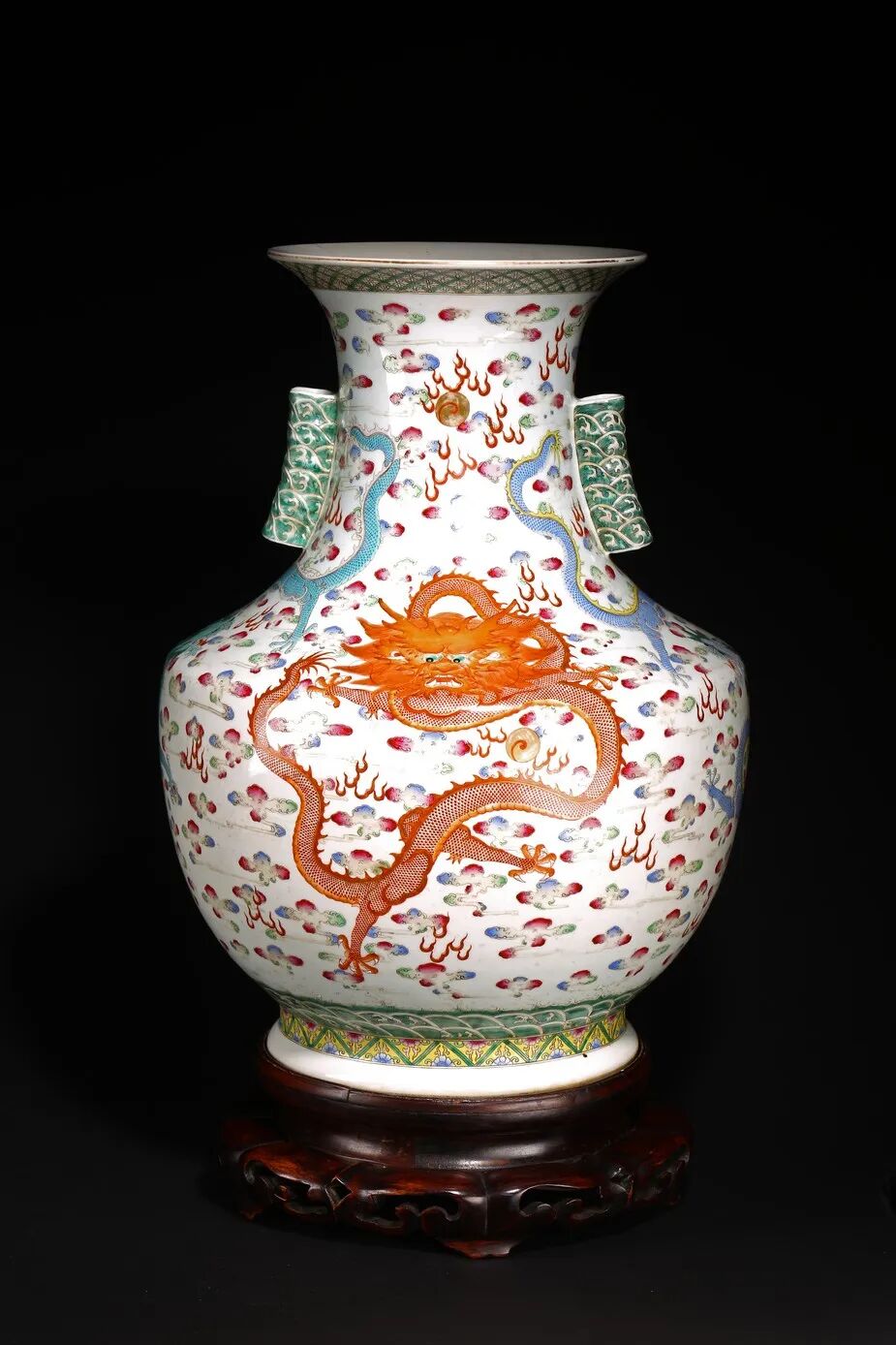 口外撇,长颈,折肩,鼓腹下收,圈足外撇。器身施粉彩绘五龙戏珠,穿梭云间。龙身矫健,弯曲灵动,双目圆瞪,张牙舞爪,威风凛凛。周边衬以火云纹和祥云缭绕,下方描绘海水波浪纹,波浪描绘细腻,层叠推进,汹涌袭来,生动逼真,十分难得。「大清光绪年制」款识。配红木座。