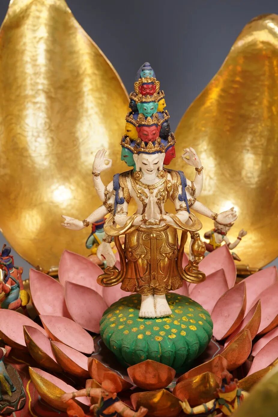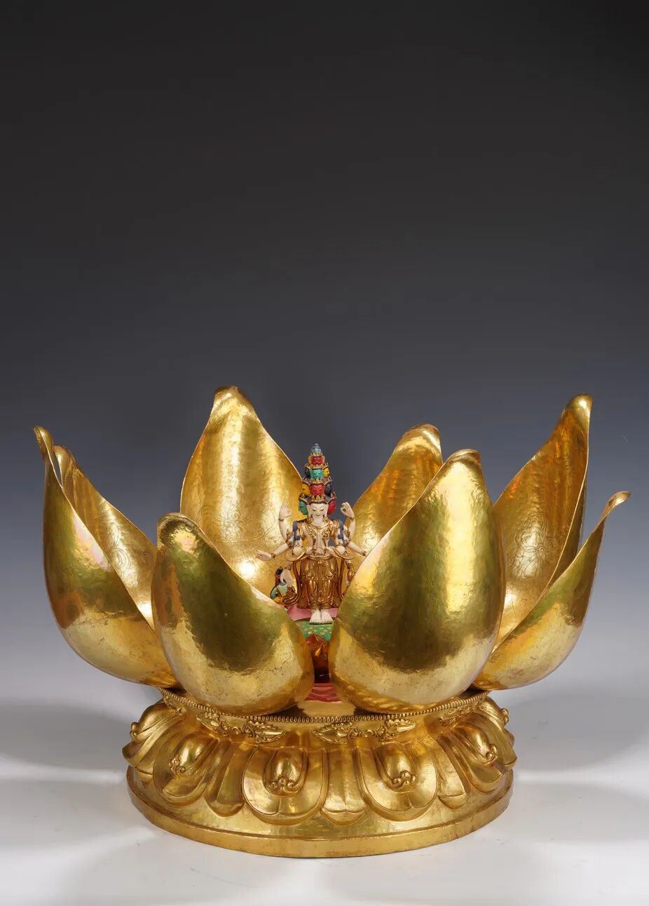 此坛城外有铜鎏金八瓣莲花,花瓣硕大鎏金厚重,花瓣内刻八宝纹饰,中间供奉八臂十一面观音站像,彩绘色彩鲜艳,另有多尊佛像于其身侧,下呈俯式莲瓣底座,花瓣饱满,攒刻工艺精湛,气势磅礴,殊胜功德。