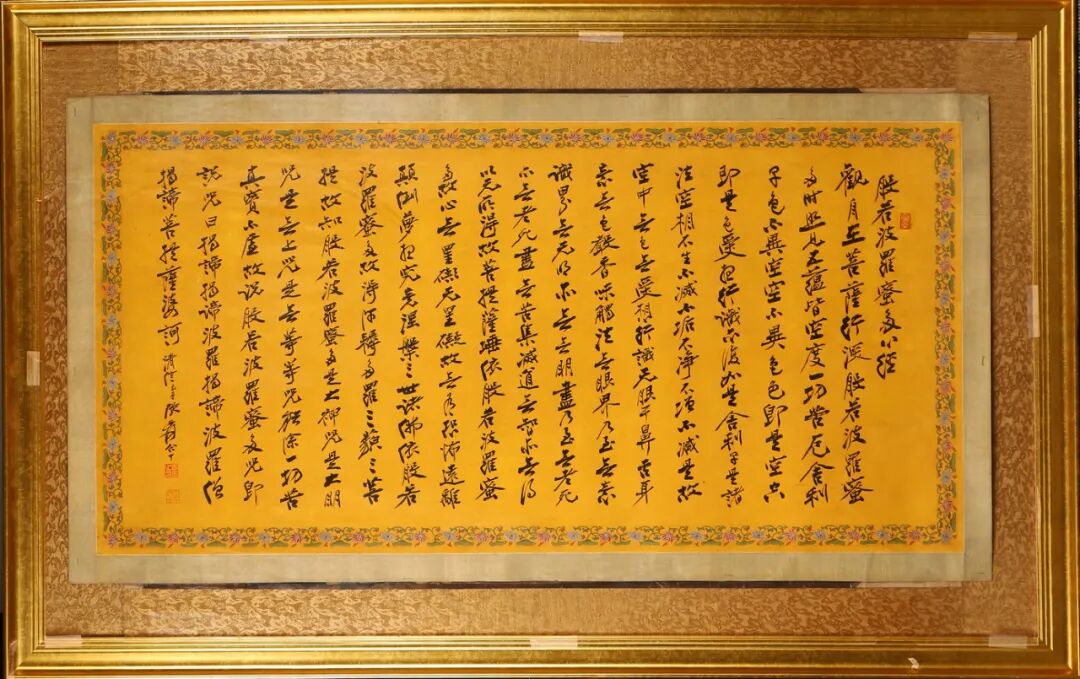 题识:般若波罗密多心经,观自在菩萨, 行深般若波罗密多时, 照见五蕴皆空, 度一切苦厄.舍利子, 色不异空, 空不异色,色即是空, 空即是色; 受想行识,亦复如是. 舍利子, 是诸法空相:不生不灭, 不垢不净, 不增不减.是故空中无色, 无受想行识, 无眼耳鼻舌身意, 无色声香味触法, 无眼界乃至无意识界,无无明, 亦无无明尽; 乃至无老死,亦无老死尽. 无苦集灭道, 无智亦无得.以无所得故, 菩提萨埵, 依般若波罗密多故,心无罣碍, 无罣碍故, 无有恐怖;远离颠倒梦想, 究竟涅槃。清信弟子张爰大千。