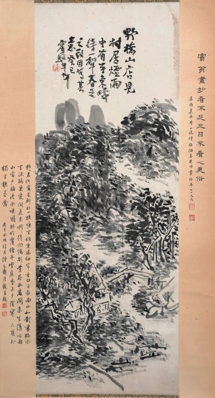 落款:癸已宾虹九十;宾翁画妙看不足三日不看心更俗辛酋嘉平月上浣傅振伦喜见因画时年七十又六;壬戌桂月陆元鼎得亲并题