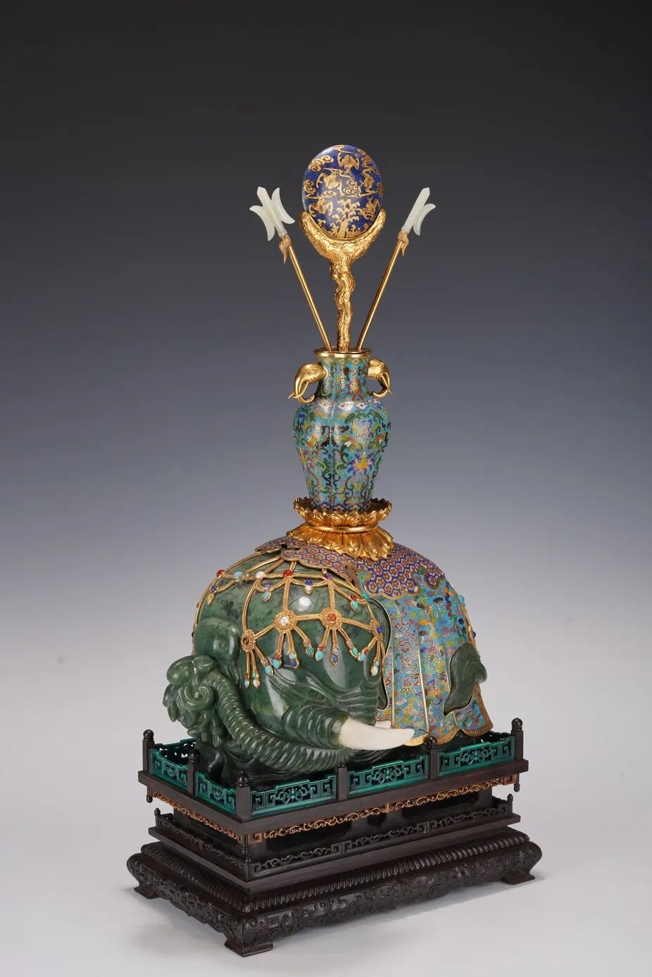 宫廷风格碧玉配掐丝珐琅鎏太平有像摆件,以整块和田碧玉圆雕而成,雕工流畅精美,象牙为和田白玉材质,温润细腻,下呈老红木嵌珐琅四弯足束腰底座,搭配廊桥,象身披掐丝珐琅鎏金宝瓶,寓意平安吉祥,宝瓶之上有白玉及青金石描金法器,护佑平安,整体端庄大气,气度非凡。