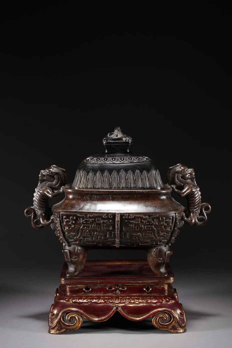 沉香材质稀有名贵,大料更是少数,选难得大料,香味淡雅,雕琢呈盖炉造型,盖为紫檀材质,兽钮、子母口、如意莲瓣纹,器身为沉香材质,腹部出戟,呈饕餮纹饰,双螭龙耳,下呈四兽足,造型仿青铜器,造型古朴,大气端庄,原配木漆金底座,宫廷气息显著,收藏难得佳品。