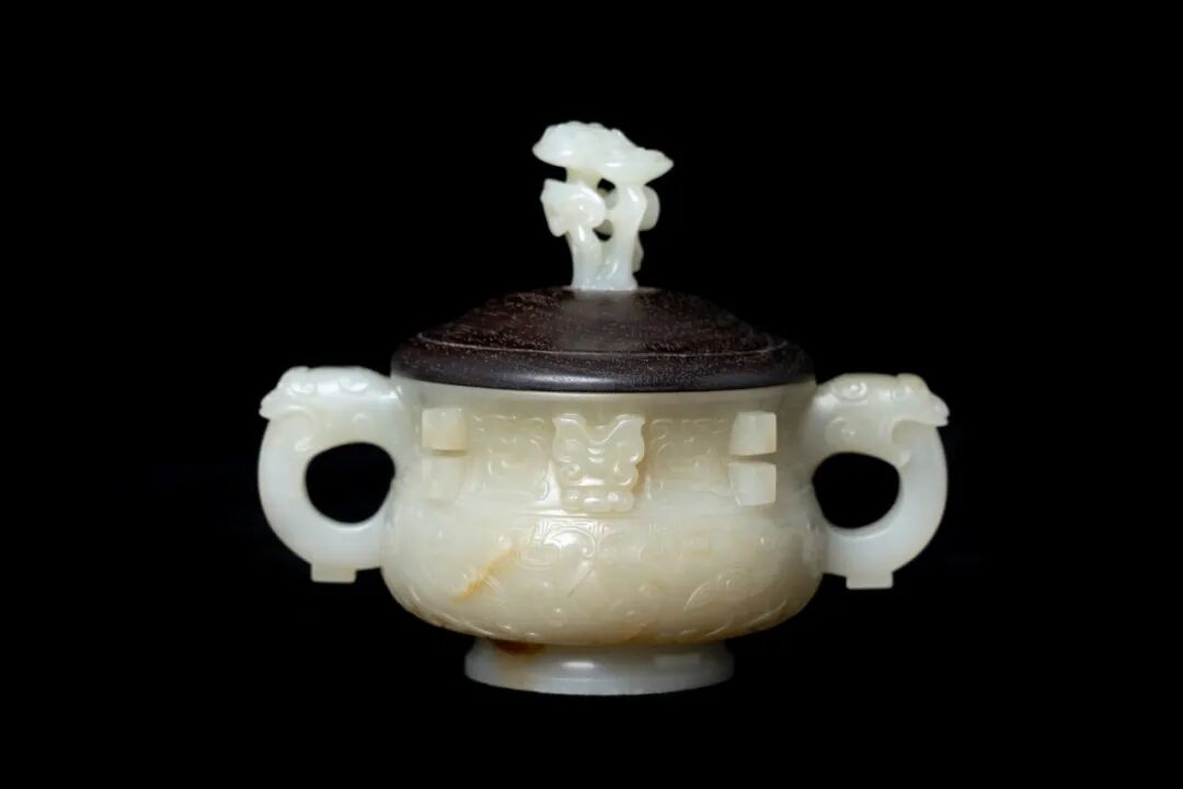 白玉香炉整料掏膛而制。为上等的和阗玉料雕制而成,玉质白皙润泽,莹润光洁,油脂感厚重,包浆醇熟。仿青铜造型,炉带红木盖,盖钮也为白玉制成,质感如真,柄根粗壮,萌出大小各异的灵芝,玉质白皙,润泽晶莹,舒展自如,立体感强烈,工艺绝佳。炉身饱满圆润,两侧饰龙耳,圆口,圆垂腹,直圈足,弧度线条优雅别致。内壁光素,打磨平滑,制作严谨。器身采用阴刻线、浅浮雕、高浮雕等技法,线条流畅如水,雕刻「夔龙纹」、「雷纹」、「兽面纹」和「饕餮纹」等,工艺极其精湛。
