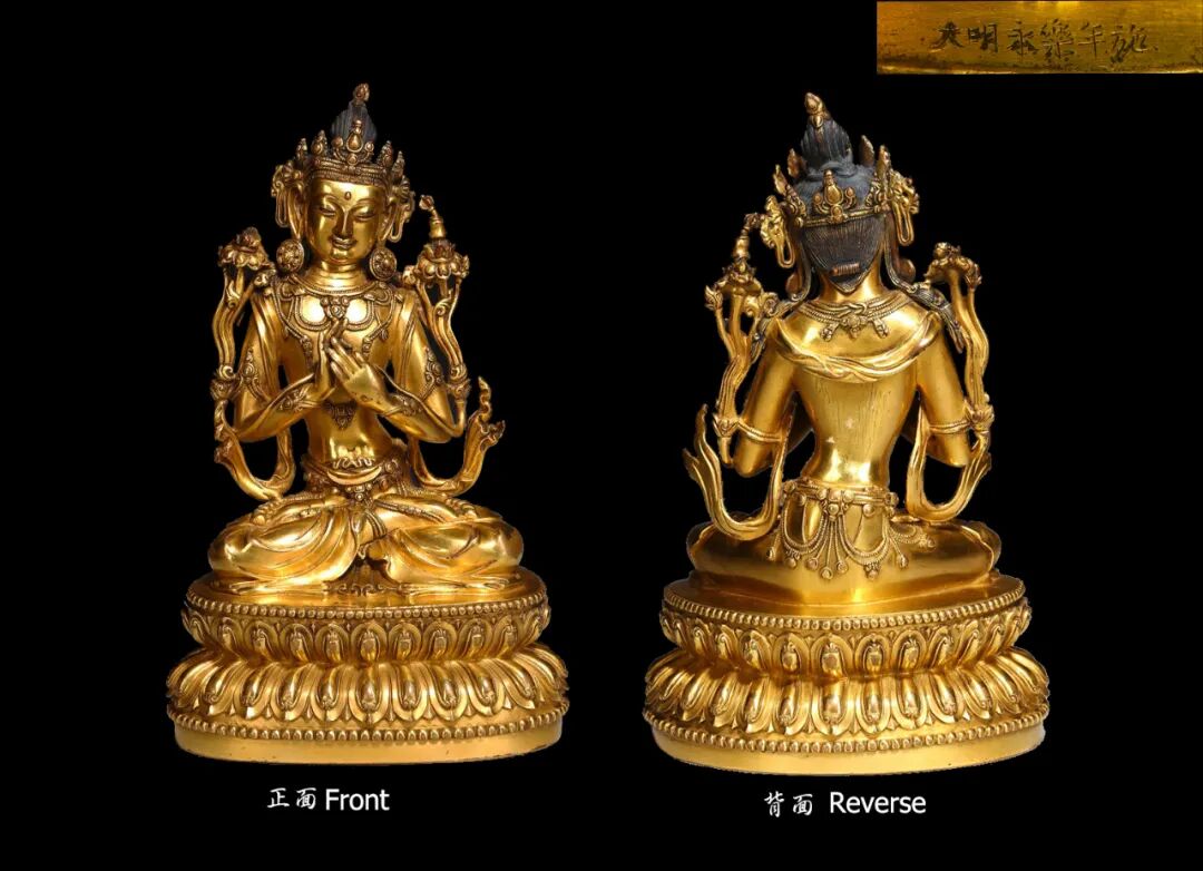 此尊文殊头戴宝冠,绀发,宝缯在耳后扎花结,呈「U」字形。面庞方形,修眉细目,眼睛微闭,庄重中蕴含慈祥,鼻高直,耳饰珰。颈有三道,胸饰璎珞,著披帛,下身穿裙,双手持莲茎,两肩各有莲花一朵。结跏趺坐,臂、腕、足有钏。仰覆莲花座上饰连珠纹。莲花宝座上横行楷书阴刻「大明永乐年施」六字款。此造像鎏金厚实,华富繁缛,充分体现了明代永乐时期宫廷的审美品位。其上身微微倾斜,细腰,宽肩的造型也明显受到印度尼泊尔工艺的影响,属永乐宫廷造像之佳作,十分难得。可比较一尊较大同时期铜鎏金文殊菩萨像,香港佳士得,2014年11月,拍品号3106, 以及同时期风格相近铜鎏金四臂文殊菩萨像,收藏于纽约大都会艺术博物馆。