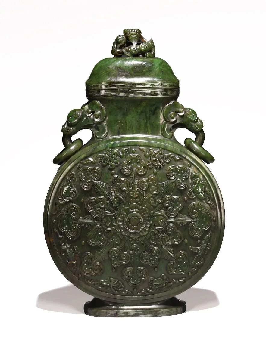 此器瓶身造型端庄秀丽,壶唇口,直颈,扁圆形腹,椭圆形圈足,肩部饰对称双耳。抱月瓶因其圆腹如满月,双耳又如同张臂抱月,故称「抱月瓶」亦称「宝月瓶」。瓶腹作正圆开窗,雕饰西番莲纹于正中,象征清正纯洁,寓意福运连绵,周边环绕法轮、法螺、宝伞、白盖、莲花、宝瓶、金鱼、盘肠结八宝吉祥纹,极尽工巧。瓶盖做蹲龙钮龙身浑然大气,豪迈舒展,形象炯炯有神,栩栩如生。此器是典型的「洋为中用」在宫中御制器物上的承载体现,抱月瓶、西番莲纹皆为西方所传,八宝吉祥纹、兽首耳、蹲龙钮则为传统中国文化之精髓,构思用意彰显皇家气度,用料为体量极大的碧玉整料,更显皇家奢华,实乃巧夺天工之作。