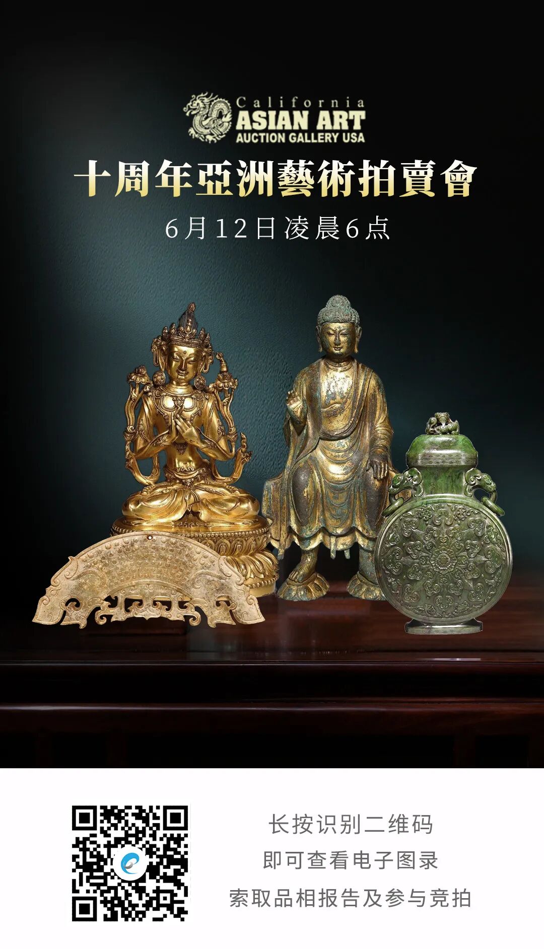 自2012年成立以来,美国加州拍卖(California Asian Art Auction Gallery USA)已走过十个春华秋实。继2月成功推出十周年庆春季重要亚洲古董艺术品专场之后,加州拍卖经过精心策划和紧锣密鼓的筹备,即将于北京时间6月12日举办『十周年庆夏季拍卖会』,联拍在线全程直播,并提供实时同步竞拍技术和服务支持。
