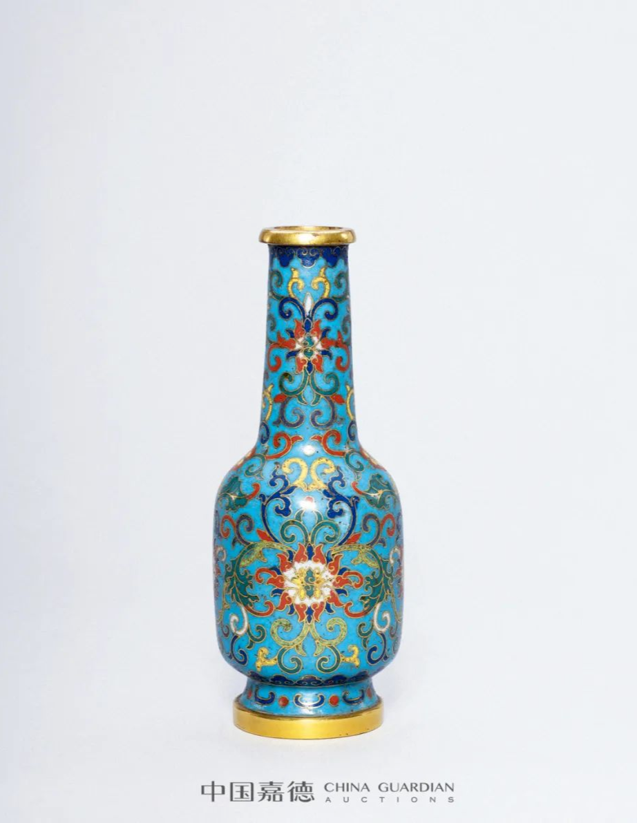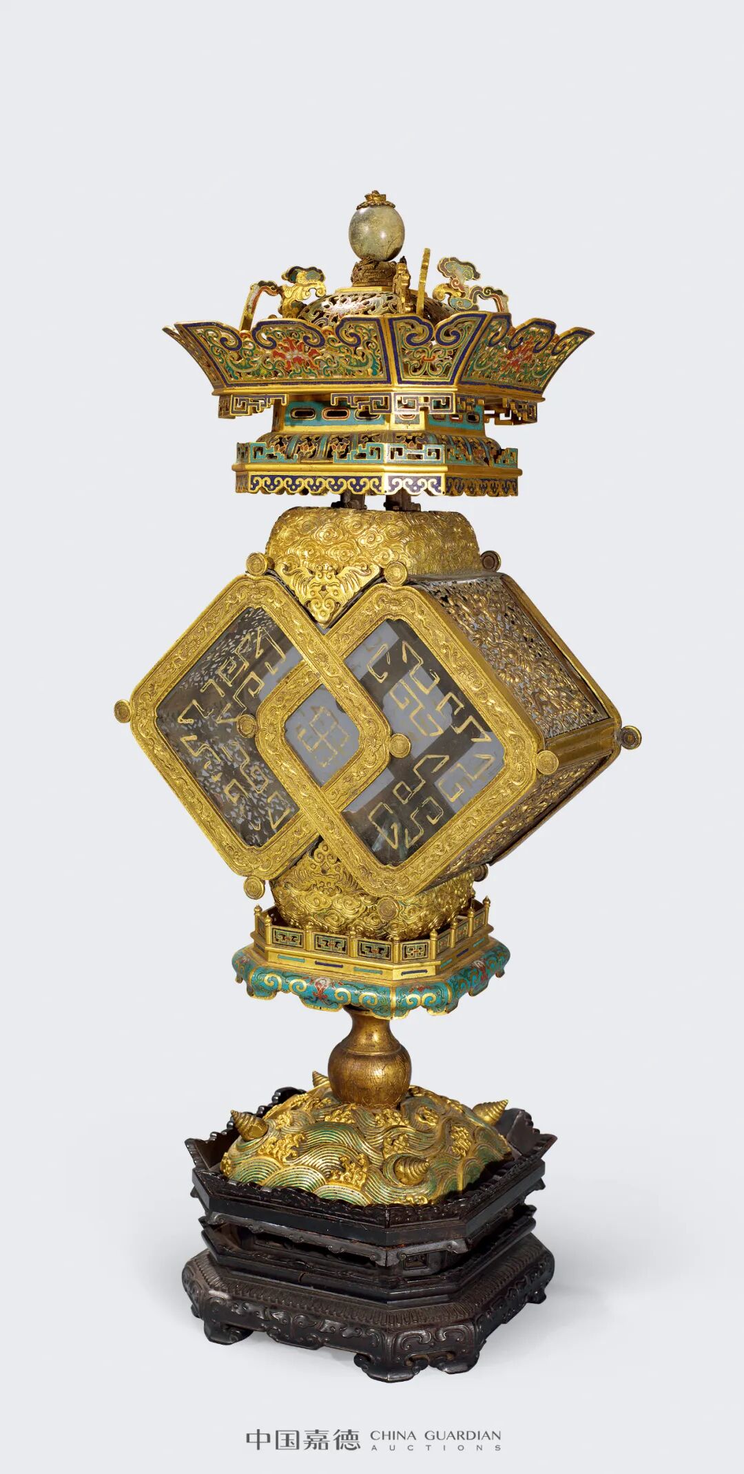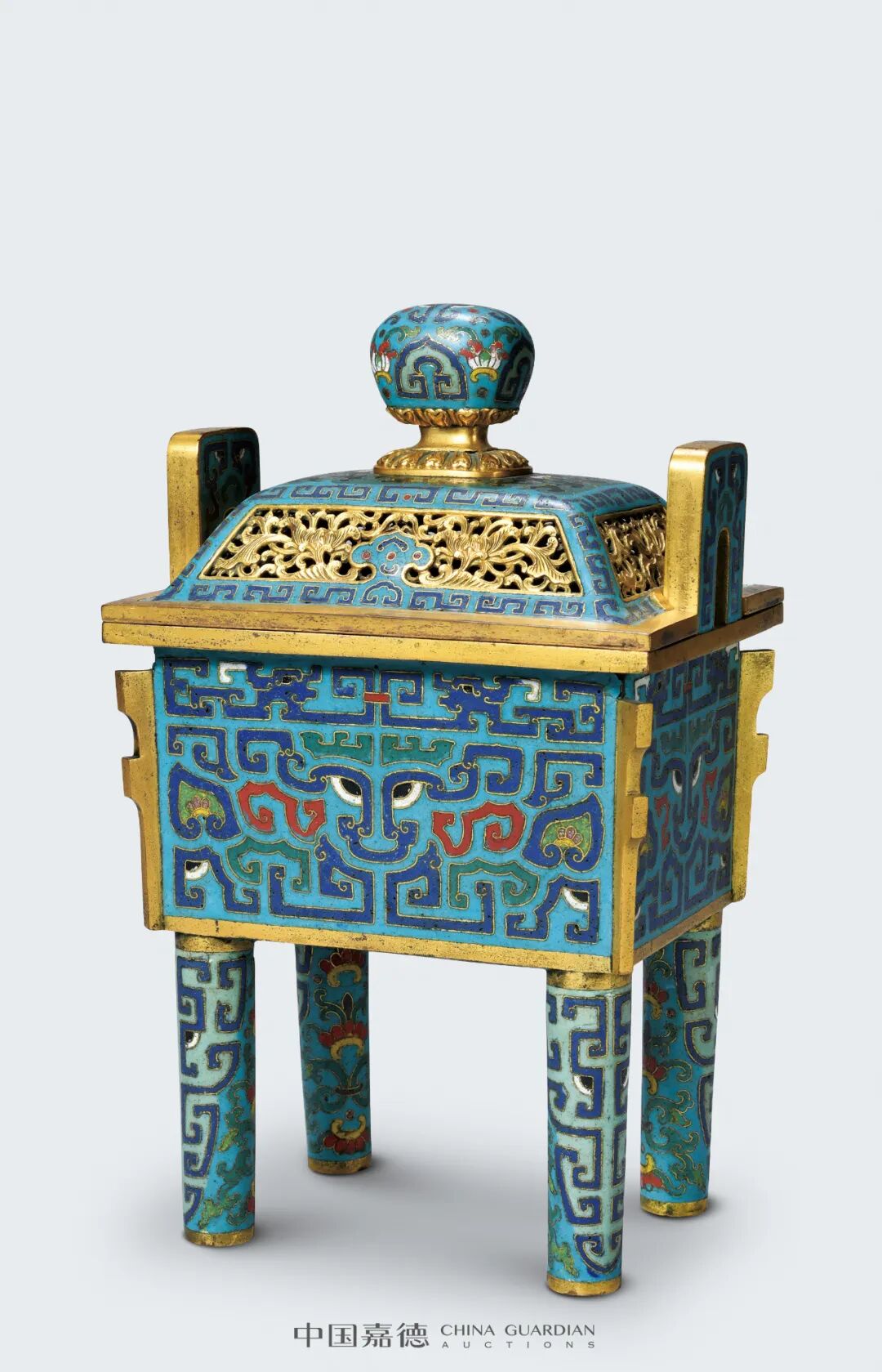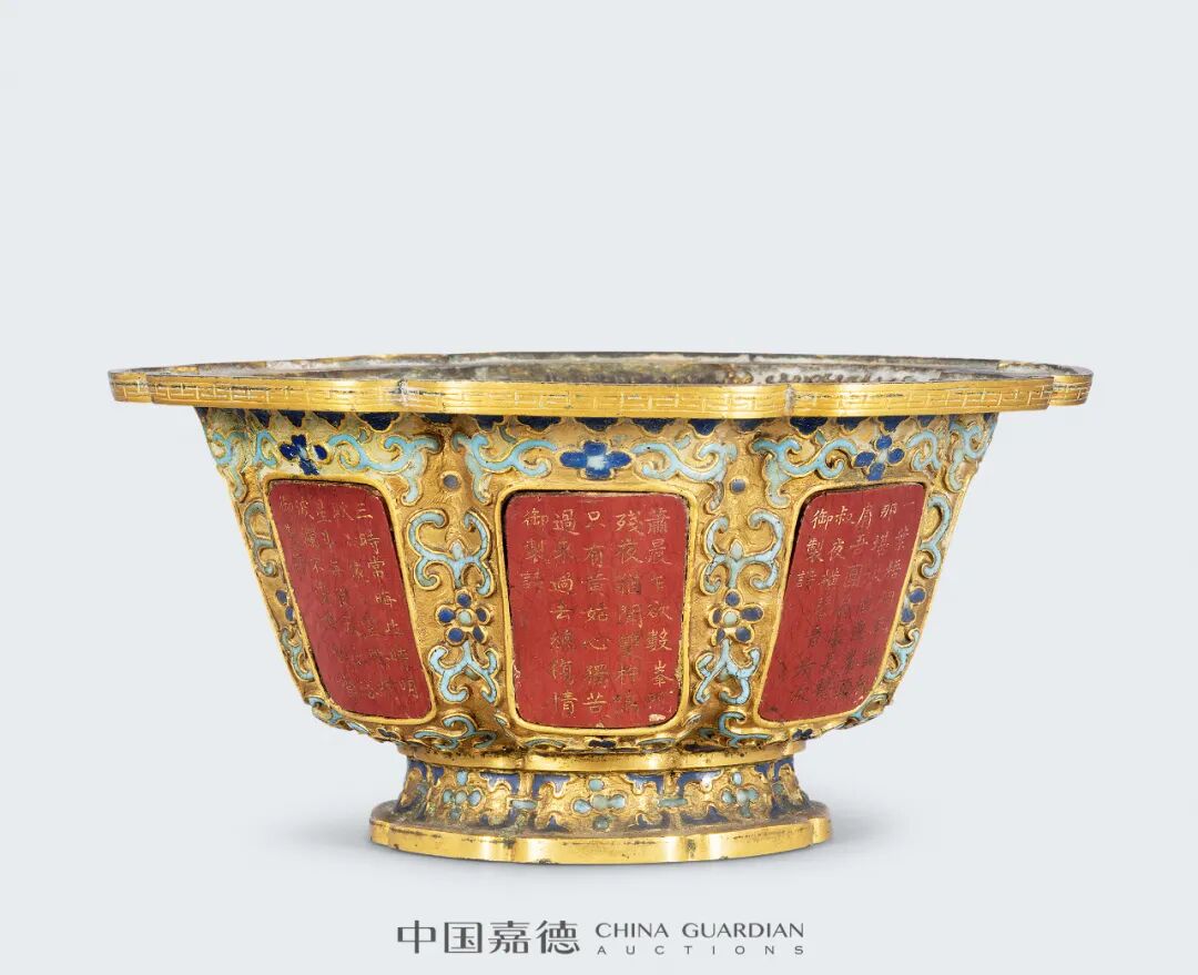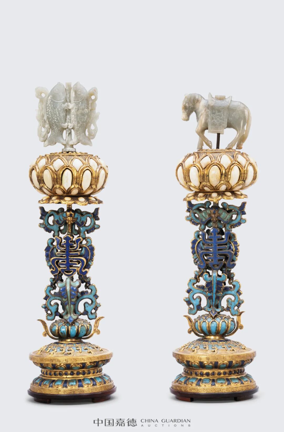 公元1790年(乾隆五十五年)农历八月十三日,是乾隆皇帝80寿诞。皇帝的诞辰日,称为万寿节,取万寿无疆之义,万寿节是清代的一大盛事。早在数年前,乾隆皇帝就指派阿桂、和珅、刘墉、福长安等大臣总办庆典事宜。为了这次寿宴,乾隆皇帝给宫廷造办处下旨,让他们特制一批庆寿器具。乾隆时期所制艺术品可视为皇帝本人艺术品位的反映,乾隆时期一改雍正时期灵秀典雅的风格,而倾向追求制作工艺精细,纹饰华丽繁缛。不仅在造型方面趋于多样化,在设色用彩等装饰工艺上更有独特的表现。宫廷造办处接不负厚望,在接到到谕旨后,精心设计,掐丝珐琅万寿无疆碗从此诞生。本拍品就是这批御制器物之一,做工精美富丽,寓意深刻。由于高度重视,乾隆亲自参与纹饰、文字的设计选定,采用了象征皇权的夔龙纹、缠绵无尽的缠枝莲纹,吉祥的佛教莲花瓣纹。《万寿无疆》碗底刻“子孙永宝”字样,其中“宝”字,经过了精心的设计,将“王、八十万寿”的历史信息藏于其中,“王、八十”,清晰可见,最后一道弧线为万的起笔,状如元宝。碗主题纹饰为万寿藤,又名缠枝莲,是中国传统吉祥纹饰,因其图案花枝缠转不断,有生生不息之意。在元、明、清三代非常盛行,被大量运用在陶瓷器、景泰蓝等工艺品上。参阅:《故宫博物院藏文物珍品大系—珐琅器编2清掐丝珐琅》,紫禁城出版社,第198页,图155此香瓶器形小巧,优美别致。通体蓝珐琅釉为地,外壁以红、黄、蓝、白等诸彩双勾线内填饰缠枝莲纹样,纹饰掐饰精细,釉质纯净细腻,色彩丰富饱满,鎏金金色灿然,是一件雅致的殿堂供奉之物。此瓶为炉瓶三式之一,作焚香用具。古代焚香用香屑,不用线香,因此需用铜箸、铜铲提取,箸瓶就是存放二物之用。底刻“乾隆年制”楷书横款及“秉”千字文款。其字摘取于千字文中的“孟轲敦素,史秉直。”,“秉”字在千字文中位列六百七十九,取千字文做掐丝珐琅器之标记乃乾隆时期之规定,为乾隆宫廷标记之用,以区别紫禁城中不同宫殿内的所属陈设物。盆景是自然景致的缩影,素有“无声的诗,立体的画”之誉。清代宫廷陈设所用盆景大多是以金玉珠宝制作的像生盆景,以衬托宫廷生活环境的堂皇富丽。清宫盆景大部分是由内务府造办处的镶嵌作制作的,其点景多用特定题材,通过象征、寓意、谐音来投合统治者的喜好。此盆以鎏金填珐琅嵌郎红瓷片装饰,不仅涉及工艺复杂,并且将御制诗刻于其上,诗文选自《清高宗御制诗集·二集·卷七十九》的“成尚继生秋旧句”八首。如《秋河》中的:“三时常晦此时明,耿耿依依空际横。星斗每从天上浴,波澜不受世间惊。御制诗。萧晨乍欲数峰隔,残夜犹闻双杵鸣。只有黄姑心独苦,过来过去总伤情。御制诗。”。《秋风》中的“一叶梧桐早识秋,那堪水面复峰头。肩吾团扇怀长系,叔夜横琴音若流。御制诗。几处关山犹远戍,谁家西北倚高楼。何人不有临风句,万古惟传杜甫愁。御制诗。”。整器制作精致,富贵典雅,为宫廷摆设之精品。清乾隆时期为清朝国力兴盛的巅峰时期,众所周知,乾隆皇帝好古,所以皇亲与大臣们都会从民间收集古物进贡宫廷。铜胎掐丝珐琅器制作至清朝乾隆达到高峰,宫廷造办处珐琅作会按旨制造出仿古代青铜器形式的嵌丝珐琅陈设器,以迎合乾隆皇帝嗜古的喜好。此鼎式炉便是仿照古代青铜四足方鼎的外型,用铜胎掐丝珐琅的工艺手法表现出来,虽少了古青铜器物的庄严和神秘感,却多了一份富丽堂皇、精巧雅致的感觉。此类香炉不仅为重要宫廷陈设器,亦用于宫中祭祀、典礼等活动,因此清宫旧藏中有不少形式近似,但大小及装饰细节不一的香炉。此件方鼎式炉铸造精湛、釉色饱满,鎏金光芒灿烂,为近似作品中罕见的佳例。清代宫灯不仅是宫廷内的实用器,亦颇为精巧的装饰品。尤在岁朝、大婚等庆典中,各种装饰华美的宫灯亦是宫中盛景,是十分吉祥的庆典陈设。此件方胜式宫灯为铜胎掐丝珐琅制,是清宫照明用器及装饰品。器分盖、罩及座三部分,灯罩作双联方胜式,取方胜盘结吉祥寓意而制,整器采用鎏金、镂雕、掐丝等诸工艺,掐丝细密,填釉饱满平整,釉色鲜艳纯正,鎏金浑厚,呈现出皇家气派的金碧辉煌。此宫灯设计华贵,造型以中式元素为主,灯罩部份相对较大,突出了实用功能,掐丝珐琅的工艺使这对宫灯在细节上可圈可点,处处彰显宫廷制的雍荣华贵。同类的掐丝珐琅方胜式宫灯可参阅纽约佳士得,2014年9月18日《浮翠流丹:美国私人珍藏掐丝珐琅》专场拍卖中的 Lot 631,成交价:106,250美金。本品造型的瓶与瓷器类的抱月瓶相同,最早仿背瓶,原本由皮革制成的便于骑马外出时携带,此瓶应是受中亚文化的影响,传入中国后相结合式样。瓶腹圆似满月,颈侧对称置如意耳如环抱瓶身,通体施浅蓝色珐琅釉为地,瓶腹开光内饰瓜瓞绵绵纹饰,寓意子孙满堂,世代相传。整器鎏金灿然,做工精致,釉色纯正,纹饰繁复,奢华富贵,宫廷风韵十足,为清代乾隆时期少见的掐丝珐琅器。清宫礼佛日盛,修建多处佛堂,所陈宗教文物盛多,佛事频繁,每天都有喇嘛在皇宫御苑中念经做法事,帝后亦经常到佛堂拈香礼佛。“七珍”“八宝”即为藏传佛教中的重要法器之一,陈设于佛堂条案。拍品即为七珍八宝中的绀马宝、双鱼两件,制作上乘,乃清宫佛堂重要陈设法器。整体錾胎填珐琅工艺极其精美。分体铸造完成后,再组合为一。由台