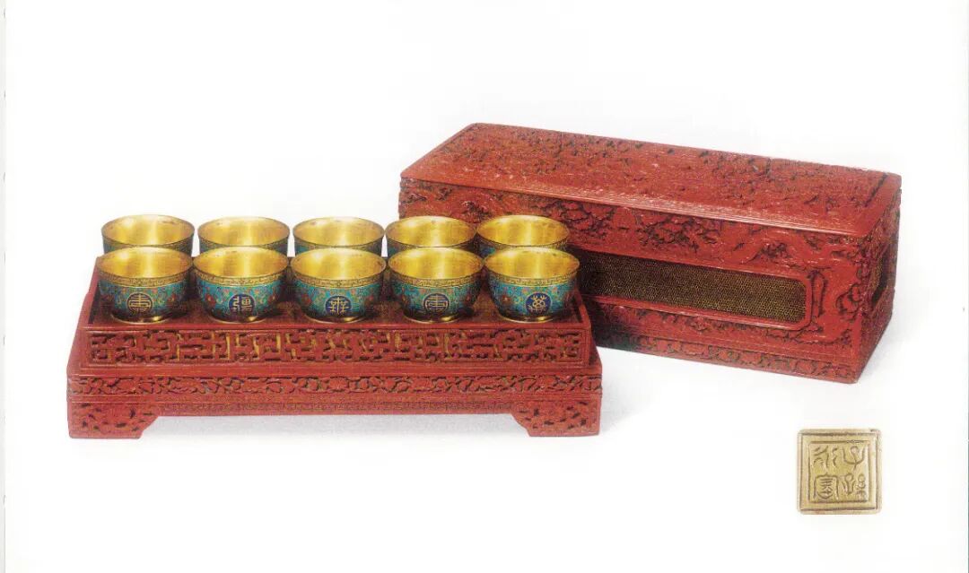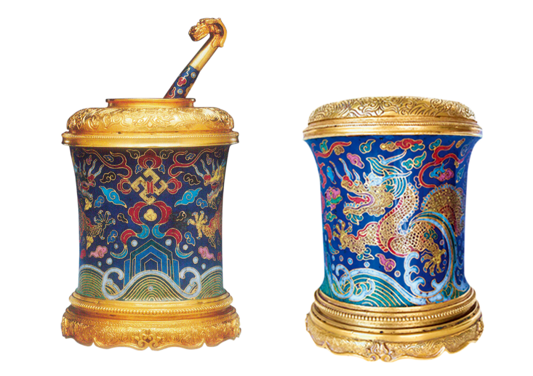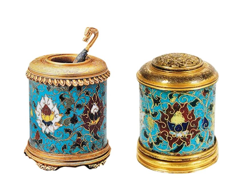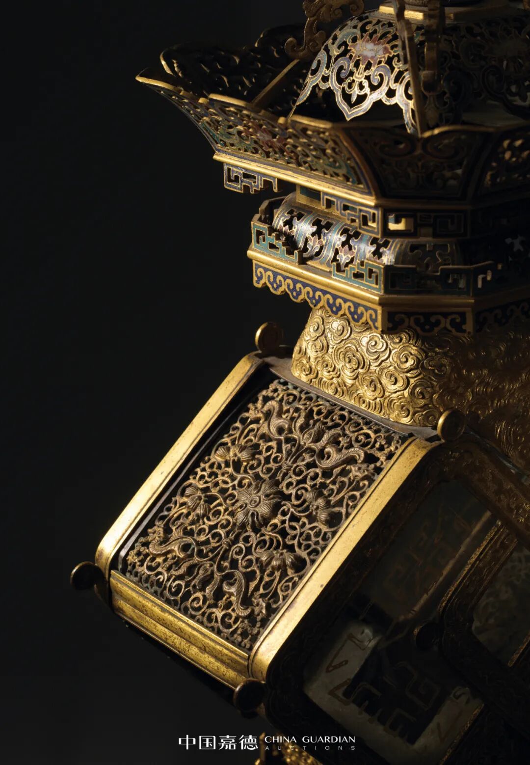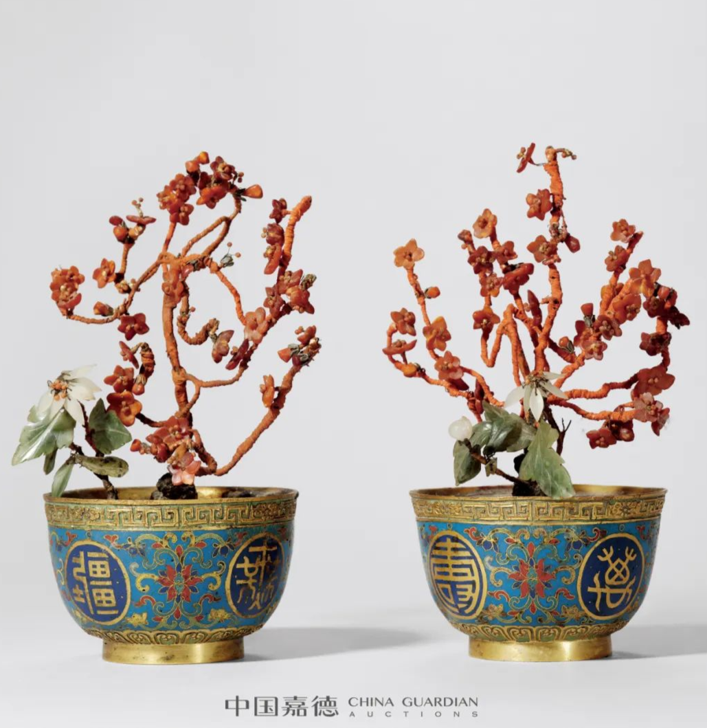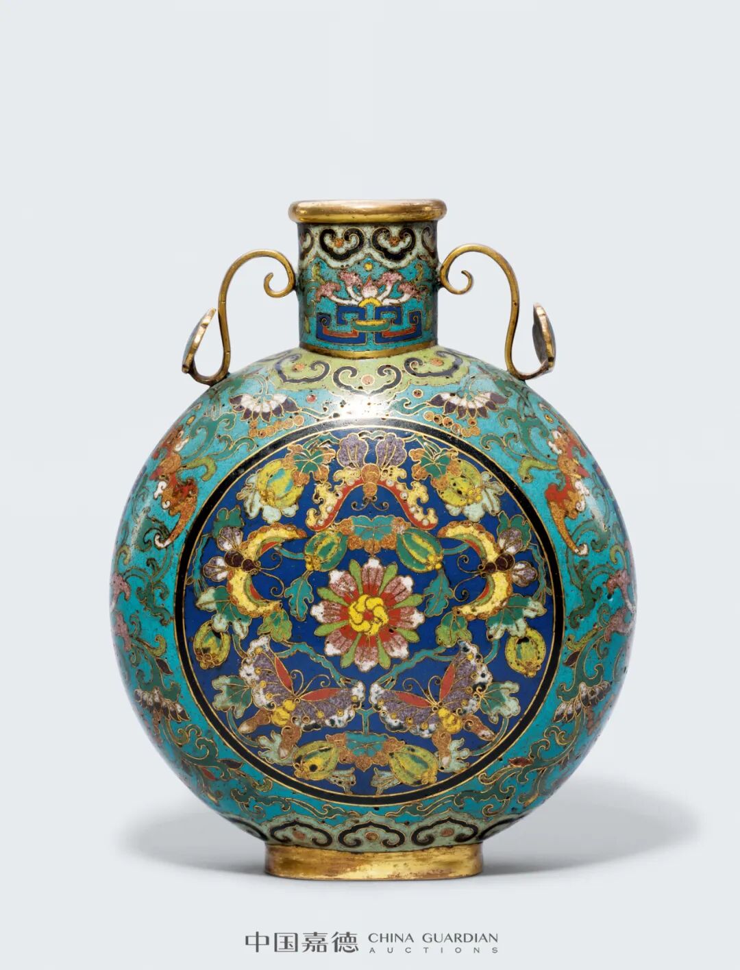 公元1790年(乾隆五十五年)农历八月十三日,是乾隆皇帝80寿诞。皇帝的诞辰日,称为万寿节,取万寿无疆之义,万寿节是清代的一大盛事。早在数年前,乾隆皇帝就指派阿桂、和珅、刘墉、福长安等大臣总办庆典事宜。为了这次寿宴,乾隆皇帝给宫廷造办处下旨,让他们特制一批庆寿器具。乾隆时期所制艺术品可视为皇帝本人艺术品位的反映,乾隆时期一改雍正时期灵秀典雅的风格,而倾向追求制作工艺精细,纹饰华丽繁缛。不仅在造型方面趋于多样化,在设色用彩等装饰工艺上更有独特的表现。宫廷造办处接不负厚望,在接到到谕旨后,精心设计,掐丝珐琅万寿无疆碗从此诞生。本拍品就是这批御制器物之一,做工精美富丽,寓意深刻。由于高度重视,乾隆亲自参与纹饰、文字的设计选定,采用了象征皇权的夔龙纹、缠绵无尽的缠枝莲纹,吉祥的佛教莲花瓣纹。《万寿无疆》碗底刻“子孙永宝”字样,其中“宝”字,经过了精心的设计,将“王、八十万寿”的历史信息藏于其中,“王、八十”,清晰可见,最后一道弧线为万的起笔,状如元宝。碗主题纹饰为万寿藤,又名缠枝莲,是中国传统吉祥纹饰,因其图案花枝缠转不断,有生生不息之意。在元、明、清三代非常盛行,被大量运用在陶瓷器、景泰蓝等工艺品上。参阅:《故宫博物院藏文物珍品大系—珐琅器编2清掐丝珐琅》,紫禁城出版社,第198页,图155此香瓶器形小巧,优美别致。通体蓝珐琅釉为地,外壁以红、黄、蓝、白等诸彩双勾线内填饰缠枝莲纹样,纹饰掐饰精细,釉质纯净细腻,色彩丰富饱满,鎏金金色灿然,是一件雅致的殿堂供奉之物。此瓶为炉瓶三式之一,作焚香用具。古代焚香用香屑,不用线香,因此需用铜箸、铜铲提取,箸瓶就是存放二物之用。底刻“乾隆年制”楷书横款及“秉”千字文款。其字摘取于千字文中的“孟轲敦素,史秉直。”,“秉”字在千字文中位列六百七十九,取千字文做掐丝珐琅器之标记乃乾隆时期之规定,为乾隆宫廷标记之用,以区别紫禁城中不同宫殿内的所属陈设物。盆景是自然景致的缩影,素有“无声的诗,立体的画”之誉。清代宫廷陈设所用盆景大多是以金玉珠宝制作的像生盆景,以衬托宫廷生活环境的堂皇富丽。清宫盆景大部分是由内务府造办处的镶嵌作制作的,其点景多用特定题材,通过象征、寓意、谐音来投合统治者的喜好。此盆以鎏金填珐琅嵌郎红瓷片装饰,不仅涉及工艺复杂,并且将御制诗刻于其上,诗文选自《清高宗御制诗集·二集·卷七十九》的“成尚继生秋旧句”八首。如《秋河》中的:“三时常晦此时明,耿耿依依空际横。星斗每从天上浴,波澜不受世间惊。御制诗。萧晨乍欲数峰隔,残夜犹闻双杵鸣。只有黄姑心独苦,过来过去总伤情。御制诗。”。《秋风》中的“一叶梧桐早识秋,那堪水面复峰头。肩吾团扇怀长系,叔夜横琴音若流。御制诗。几处关山犹远戍,谁家西北倚高楼。何人不有临风句,万古惟传杜甫愁。御制诗。”。整器制作精致,富贵典雅,为宫廷摆设之精品。清乾隆时期为清朝国力兴盛的巅峰时期,众所周知,乾隆皇帝好古,所以皇亲与大臣们都会从民间收集古物进贡宫廷。铜胎掐丝珐琅器制作至清朝乾隆达到高峰,宫廷造办处珐琅作会按旨制造出仿古代青铜器形式的嵌丝珐琅陈设器,以迎合乾隆皇帝嗜古的喜好。此鼎式炉便是仿照古代青铜四足方鼎的外型,用铜胎掐丝珐琅的工艺手法表现出来,虽少了古青铜器物的庄严和神秘感,却多了一份富丽堂皇、精巧雅致的感觉。此类香炉不仅为重要宫廷陈设器,亦用于宫中祭祀、典礼等活动,因此清宫旧藏中有不少形式近似,但大小及装饰细节不一的香炉。此件方鼎式炉铸造精湛、釉色饱满,鎏金光芒灿烂,为近似作品中罕见的佳例。清代宫灯不仅是宫廷内的实用器,亦颇为精巧的装饰品。尤在岁朝、大婚等庆典中,各种装饰华美的宫灯亦是宫中盛景,是十分吉祥的庆典陈设。此件方胜式宫灯为铜胎掐丝珐琅制,是清宫照明用器及装饰品。器分盖、罩及座三部分,灯罩作双联方胜式,取方胜盘结吉祥寓意而制,整器采用鎏金、镂雕、掐丝等诸工艺,掐丝细密,填釉饱满平整,釉色鲜艳纯正,鎏金浑厚,呈现出皇家气派的金碧辉煌。此宫灯设计华贵,造型以中式元素为主,灯罩部份相对较大,突出了实用功能,掐丝珐琅的工艺使这对宫灯在细节上可圈可点,处处彰显宫廷制的雍荣华贵。同类的掐丝珐琅方胜式宫灯可参阅纽约佳士得,2014年9月18日《浮翠流丹:美国私人珍藏掐丝珐琅》专场拍卖中的 Lot 631,成交价:106,250美金。本品造型的瓶与瓷器类的抱月瓶相同,最早仿背瓶,原本由皮革制成的便于骑马外出时携带,此瓶应是受中亚文化的影响,传入中国后相结合式样。瓶腹圆似满月,颈侧对称置如意耳如环抱瓶身,通体施浅蓝色珐琅釉为地,瓶腹开光内饰瓜瓞绵绵纹饰,寓意子孙满堂,世代相传。整器鎏金灿然,做工精致,釉色纯正,纹饰繁复,奢华富贵,宫廷风韵十足,为清代乾隆时期少见的掐丝珐琅器。清宫礼佛日盛,修建多处佛堂,所陈宗教文物盛多,佛事频繁,每天都有喇嘛在皇宫御苑中念经做法事,帝后亦经常到佛堂拈香礼佛。“七珍”“八宝”即为藏传佛教中的重要法器之一,陈设于佛堂条案。拍品即为七珍八宝中的绀马宝、双鱼两件,制作上乘,乃清宫佛堂重要陈设法器。整体錾胎填珐琅工艺极其精美。分体铸造完成后,再组合为一。由台