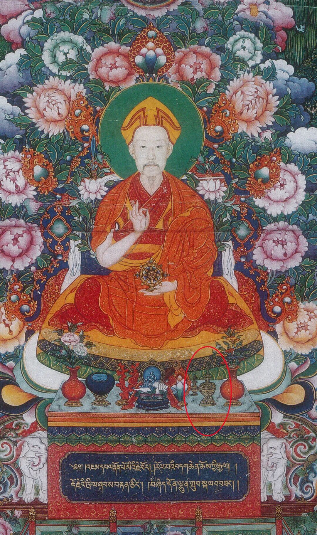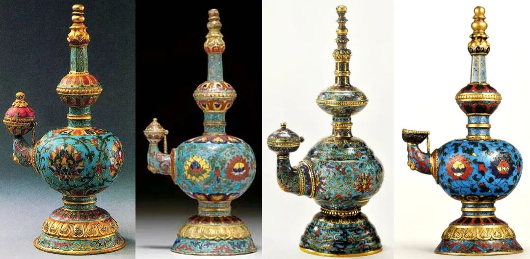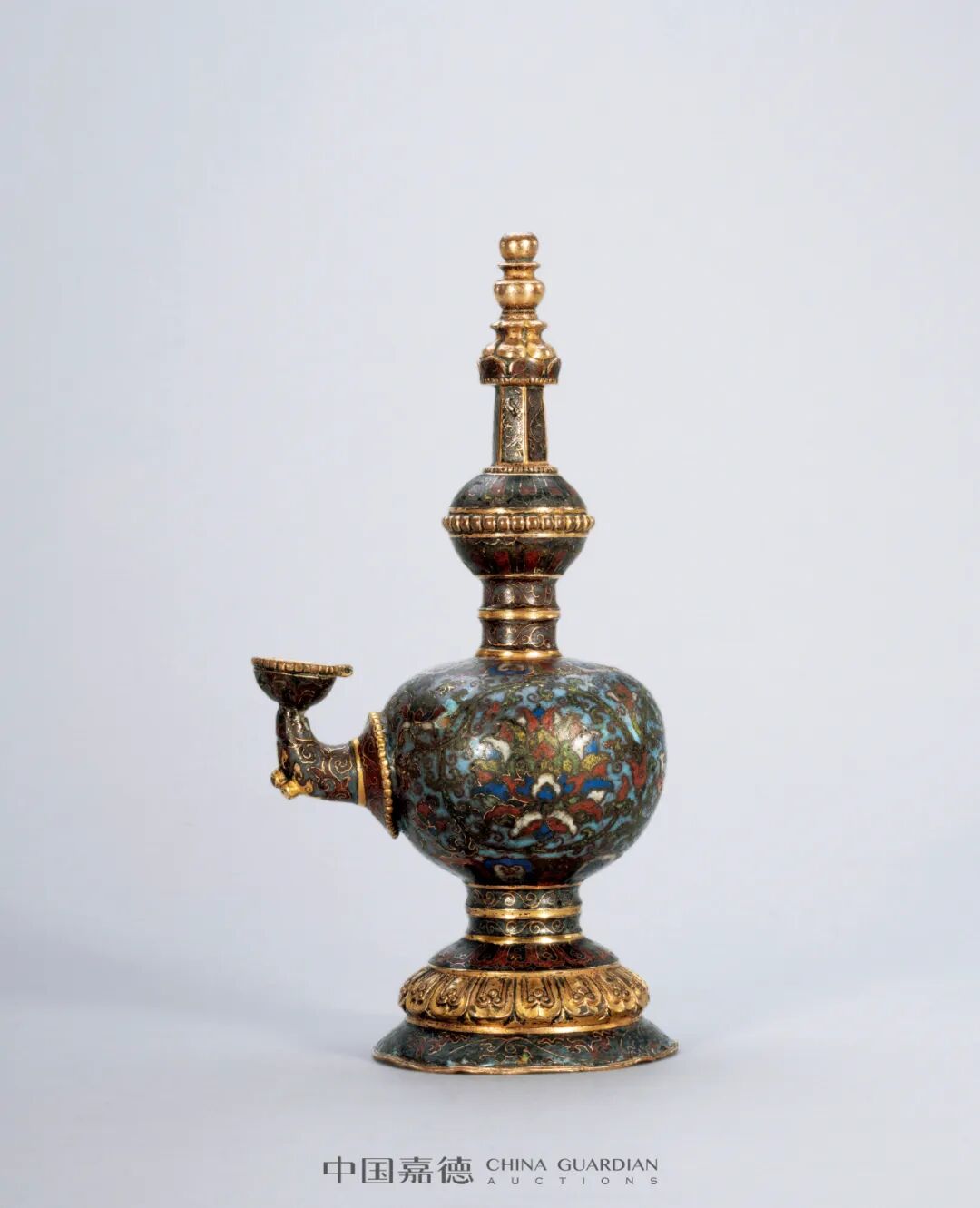 底刻“宣德年制”四字二行楷书款,且底承炉座,殊为难得。整件炉器色彩典雅,掐丝精细,花纹流畅,釉色亦较为厚重,具有清康熙掐丝珐琅的特点。奔巴,也写作“本巴”,是藏语“bumpa”的音译,本意是指“瓶”。一般习惯将有流的奔巴称为“奔巴壶”。奔巴壶是藏传佛教重要的法器,用来装圣水(清水泡藏红花),用于浴佛或者灌顶仪式中,所以又被称为“净水壶”。同时也是弥佛的重要标识物。其形由早期的军持演变而来。奔巴壶式样主要有三种,最经典的式样为塔式奔巴壶,因身似宝塔,顶有宝珠而得名。本拍品即为经典的塔式奔巴壶。《乾隆帝普宁寺佛装像》中供桌上也供奉有塔式奔巴壶。除此以外还有曲流式奔巴壶和直流式奔巴壶。奔巴壶材料丰富,多见铜质、铜鎏金或银质。宫廷制作多为瓷质,也有少量的金质和珐琅质。《乾隆帝普宁寺佛装像》