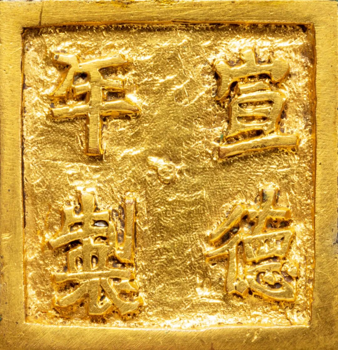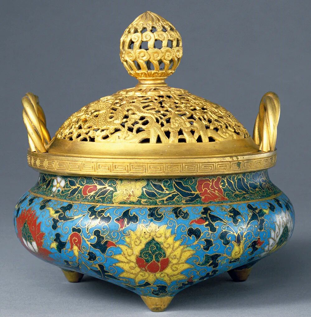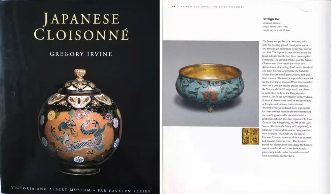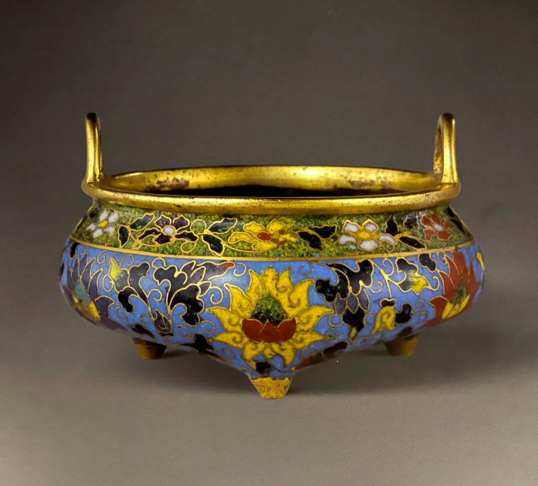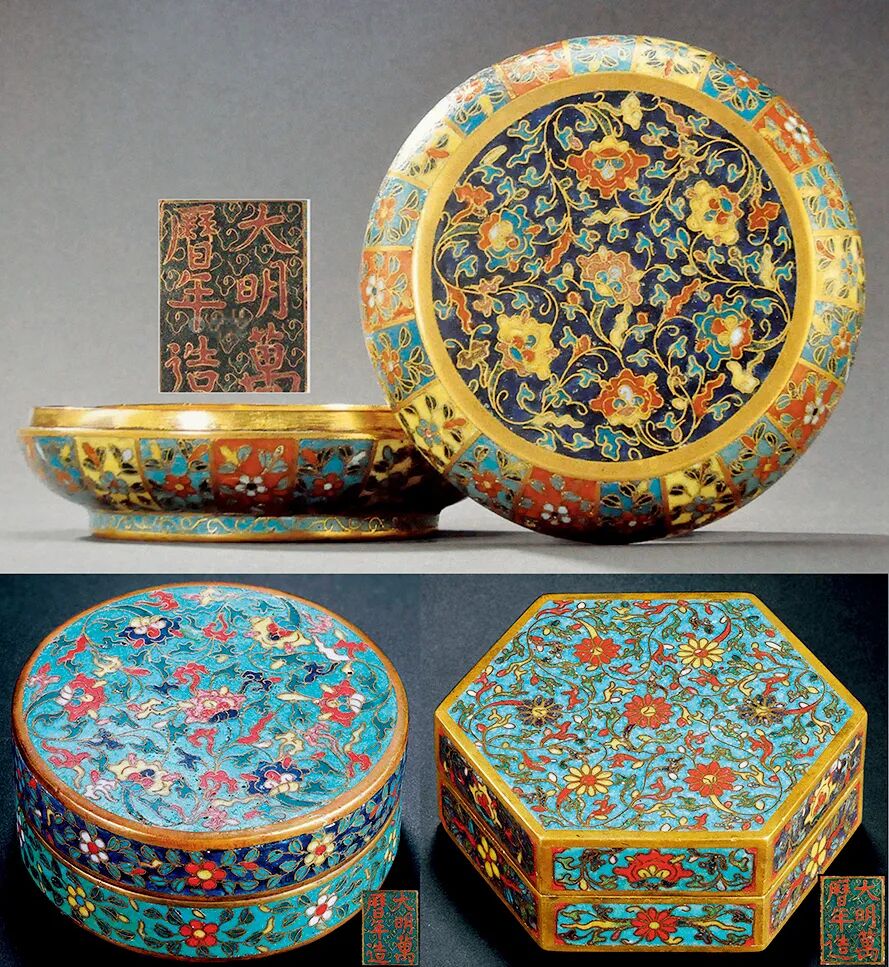 1、胎和丝皆为低锌黄铜。胎体厚重,掐丝少见劈裂,几乎不使用锦地。2、釉色主要由红、黄、绿、青、蓝、白六色组成,偶有紫色。各种颜色纯正、饱满,除了绿色和紫色微透,其余颜色均失透。青色是鉴别要点,宣德青色成色剂为进口钴料,颜色纯净而艳丽,色如群青,是最纯的青金石色。明中以后,青色灰而微透。宣德这种优质的的青色直到300年以后才再次出现。宣德时期掐丝珐琅,在单一丝框中,多施一种釉色,偶尔有两种釉料组合使用的情况。比如,叶子施绿釉,但在叶子尖部点缀小面积的红釉或黄釉。而混合釉(以两种或以上颜色釉粉组成的新釉色)还很少出现。比如明粉、松绿等都是明中以后才大量出现的。