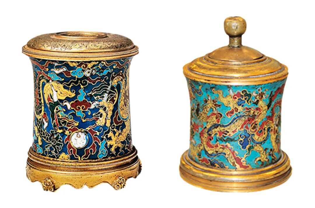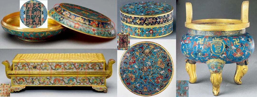 3、宣德时期逐渐形成了以缠枝莲纹为主的纹饰风格。宣德时期的缠枝莲纹特征明显,是后世所不具备的。宣德时期,花朵总体饱满、圆润,呈现横宽竖窄的比例。花朵的莲瓣和莲蕊各不相同。在同一组缠枝莲纹中常使用不同形状的花朵有序排列而成。而明中以后,在同一组缠枝莲中,花朵形状都一样。缠枝莲纹越往后,莲瓣和莲叶越渐形式化,到明晚期莲瓣拉长、凌乱,叶子呈“斗号”形,图案已经完全符号化。本件拍品“明宣德 掐丝珐琅缠枝莲纹水丞”就是一件明代宣德年制作的掐丝珐琅标准器。宣德掐丝珐琅多见香炉、香盒和瓶子一类。而文房用品极其罕见。右:Thomas N. Miller 拍卖 明 掐丝珐琅龙纹水丞目前所知宣德时期掐丝珐琅水丞可参阅的有两件。故宫博物院有一件明宣德 掐丝珐琅龙纹水丞,2019年5月英国ThomasN.Miller拍卖过一只明 掐丝珐琅龙纹水丞,也应为宣德器。左:台湾故宫博物院藏 明中期 掐丝珐琅缠枝莲纹水丞明中期 掐丝珐琅水丞也见两件,一件为台湾故宫博物院藏,另外一件为2015年6月法国拍卖会。两件均为缠枝莲纹。此件掐丝珐琅水丞及以上四件明代掐丝珐琅水丞,金属口沿和底均为后期添加,所改年代不一。个别添加“景泰年制”刻款。