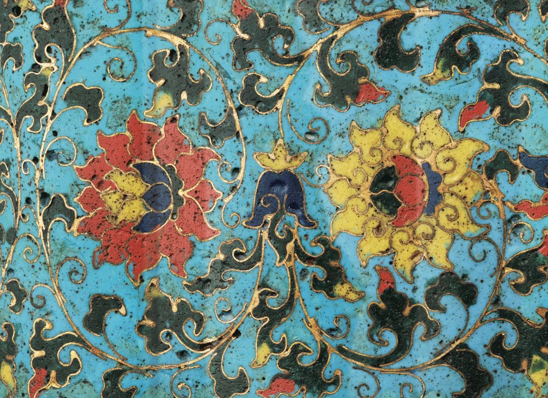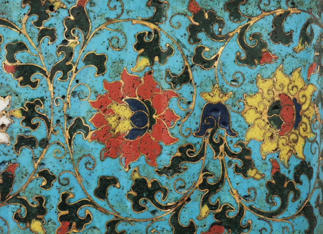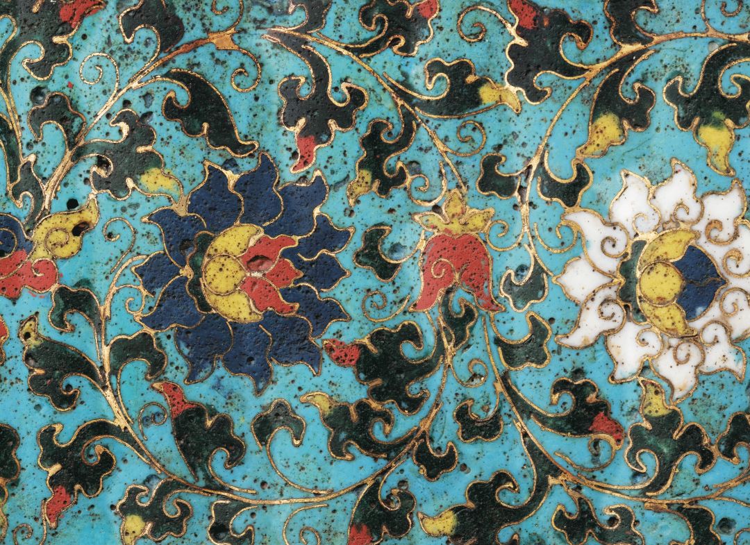 整器以精铜为胎,质地坚实细腻,器表以天蓝色珐琅釉为地,色泽纯净均匀,其上掐丝勾勒线条,填入各色珐琅彩绘饰图案,色调沈稳而雍容。其以缠枝莲纹为装饰图案,藤叶自肩部向下蔓生,蜿蜒于器表,枝叶宽厚,叶脉之中又以掐丝金线表现茎杆纹路,虽为装饰纹样,亦可体现叶脉波折之态。![]()