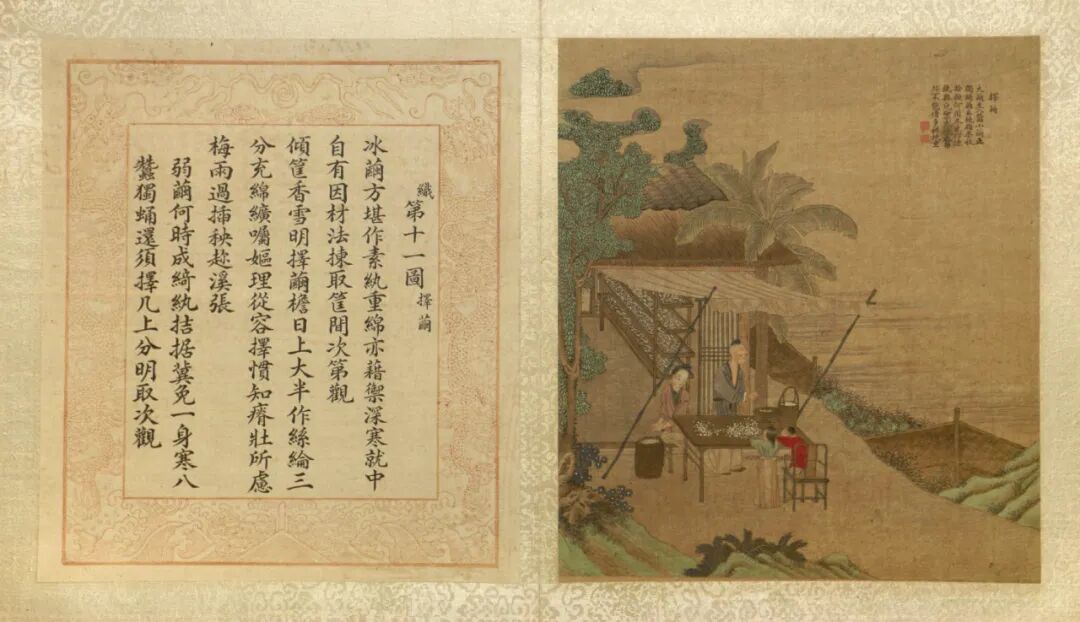 康熙《御制耕织全图》计有“耕图”和“织图”各23幅。其中“择茧”属织部第十一图,是养蚕缫丝过程中的一个步骤,即拣选优质的蚕茧。《耕织图》深受康熙皇帝喜爱,以至于康熙认为摹绘耕织图仍不足以尽意,于是在其授意下,景德镇御窑承命以《御制耕织全图》为蓝本,于康熙三十五年(1699年)起,烧制了一批既可赏玩,又可以起到警示和推广作用的御题诗耕织图瓷器,可谓用心良苦。