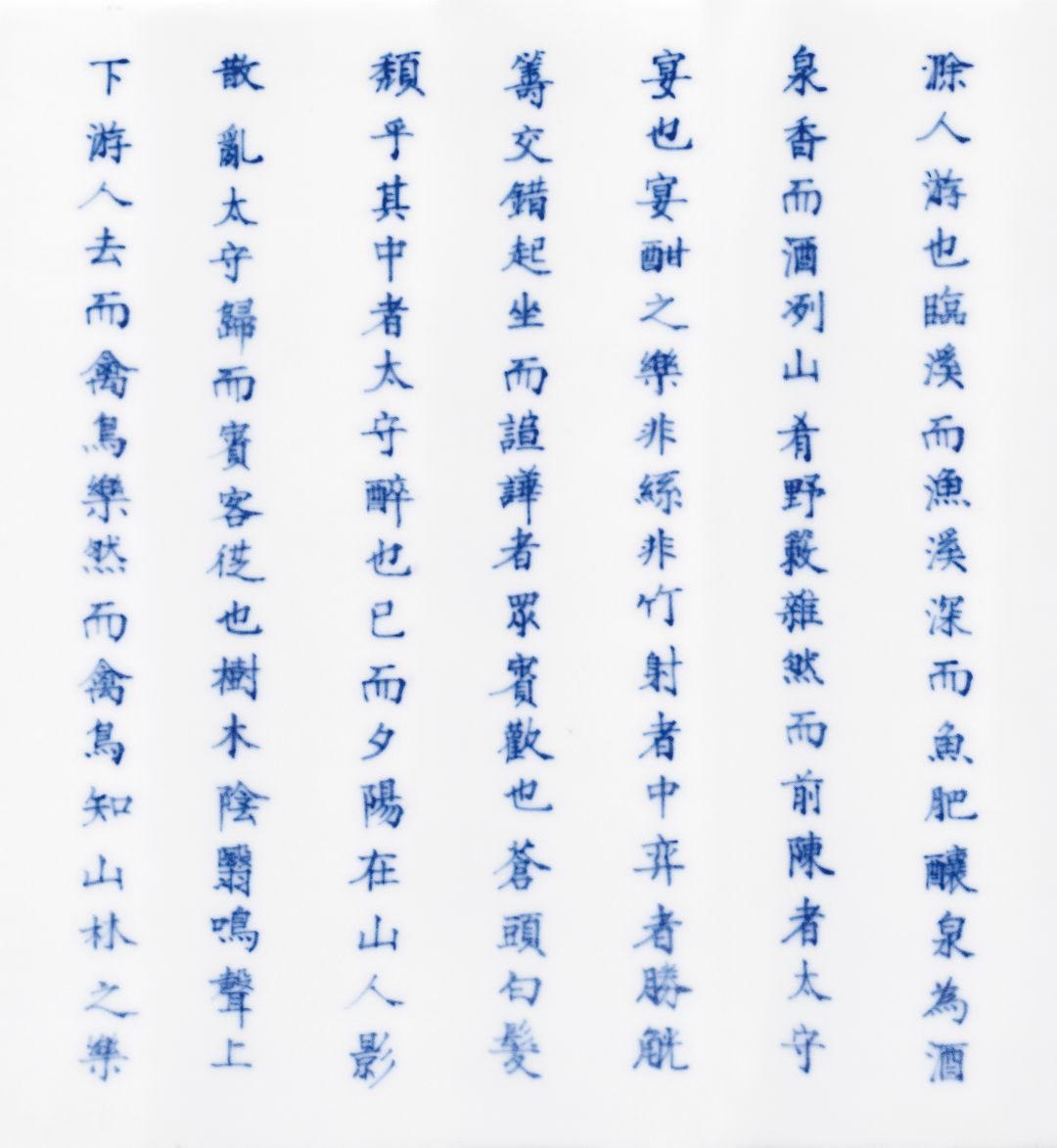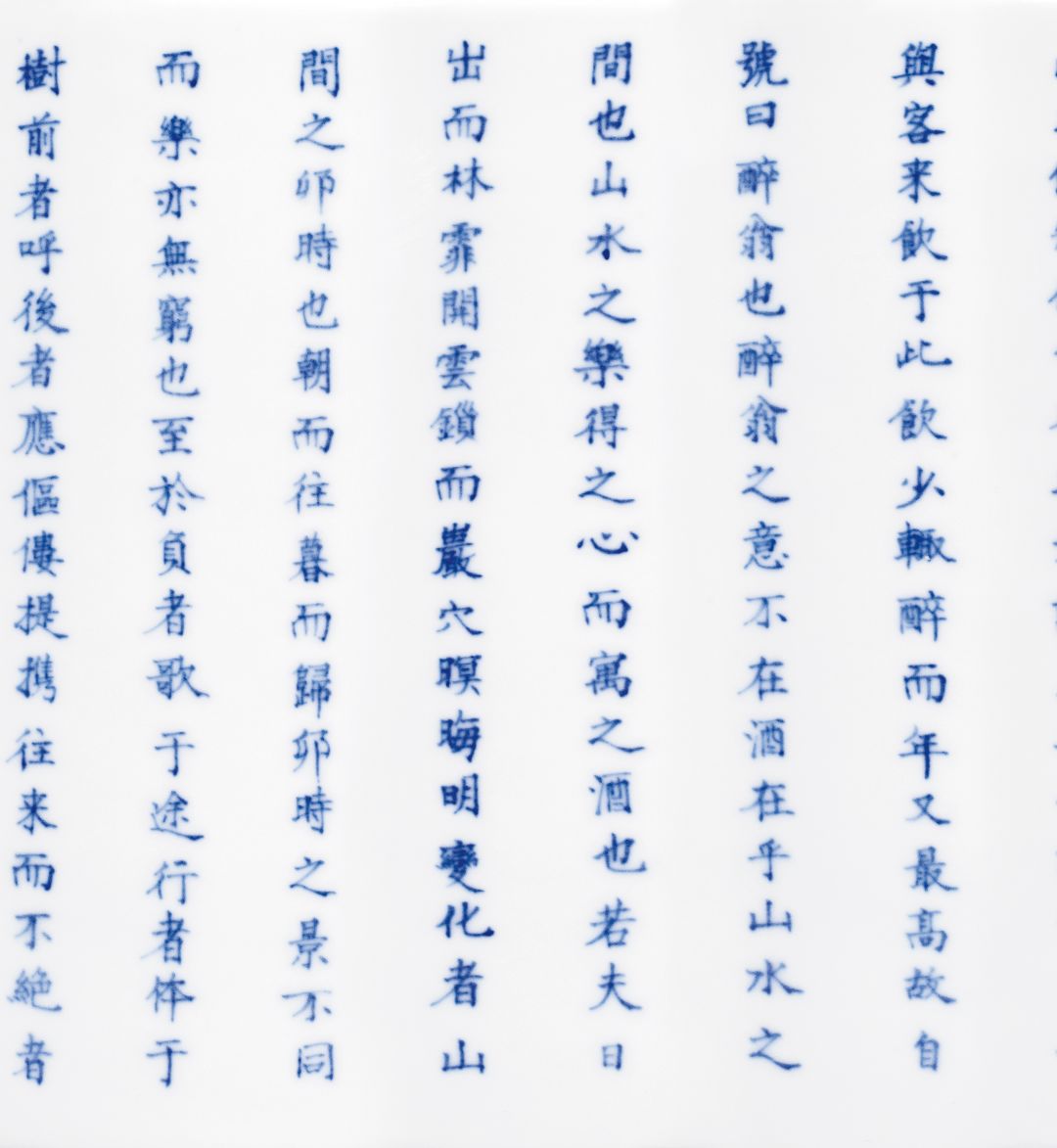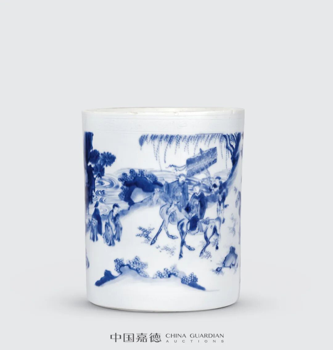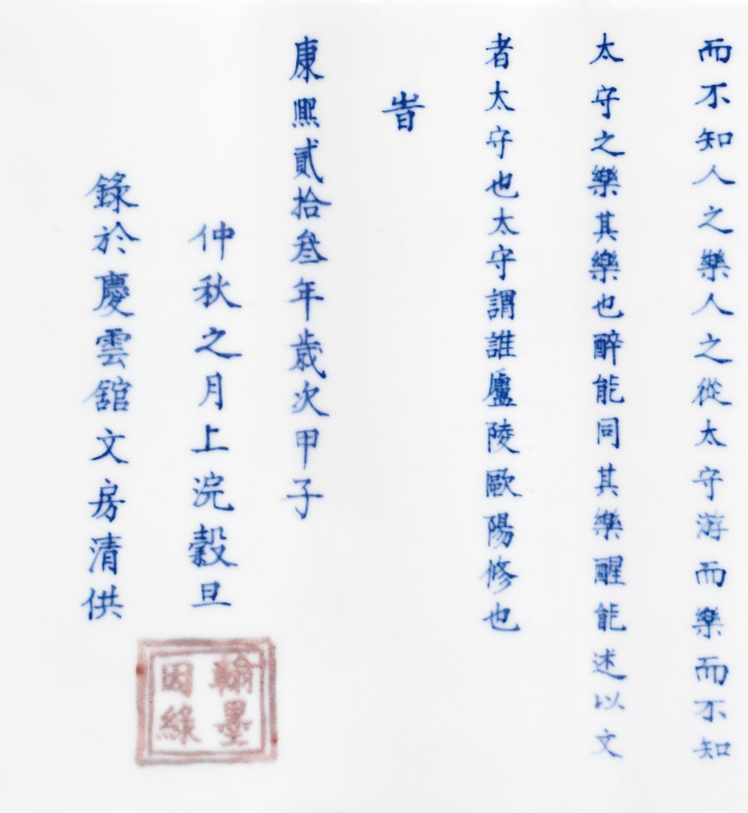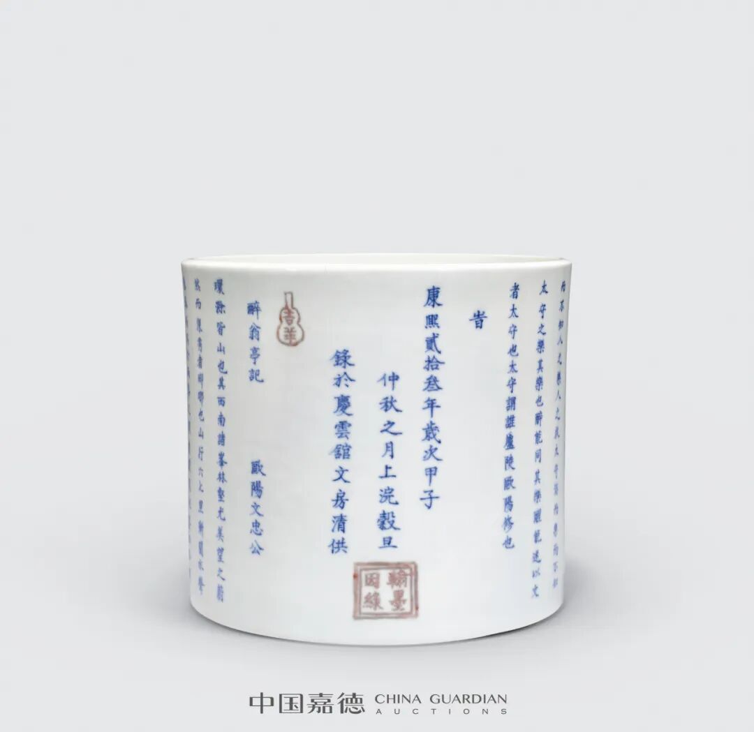 明末清初各类文房用具盛烧,且装饰纹饰显现出强烈的文人意趣。康熙时期即曾大量烧造瓷质笔筒,并于其上书写长篇诗文,为当朝所特有,深受后世追捧,其中以书纪年款者尤显珍贵,具有极高的研究价值。许之衡《饮流斋说瓷》赞曰:“书长篇成文者,如《赤壁赋》、《圣主得贤臣颂》……《出师表》。皆全篇录其。笔法出入虞(世南)、褚(遂良),均康窑之铮铮者。”而本品即为此属。本品胎釉俱佳,青花发色精绝,书法高绝,笔意流畅,格调高雅脱俗,实为康熙诗文笔海之佳品,且具明确的康熙纪年,是一件具有极高收藏价值和研究价值的文房上品。