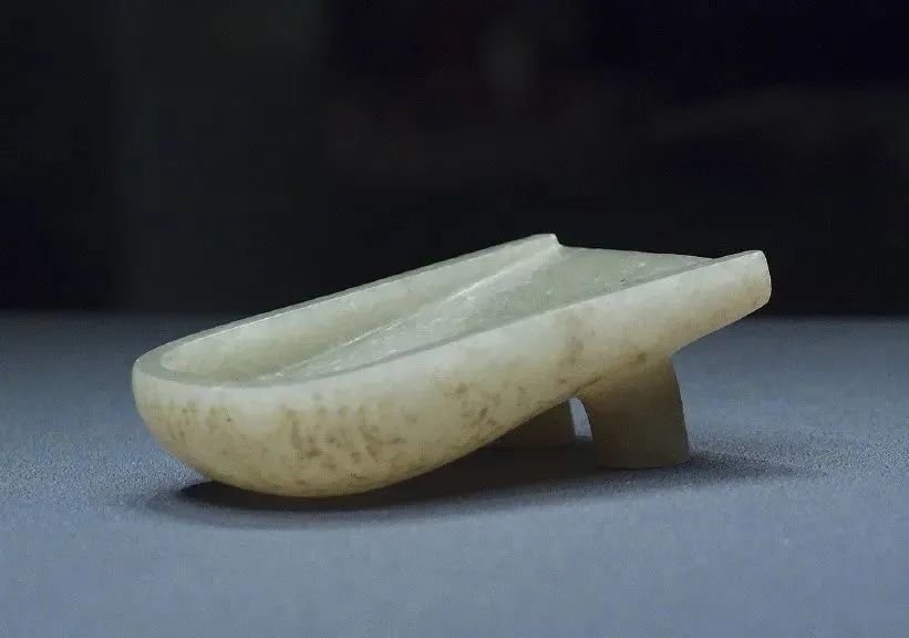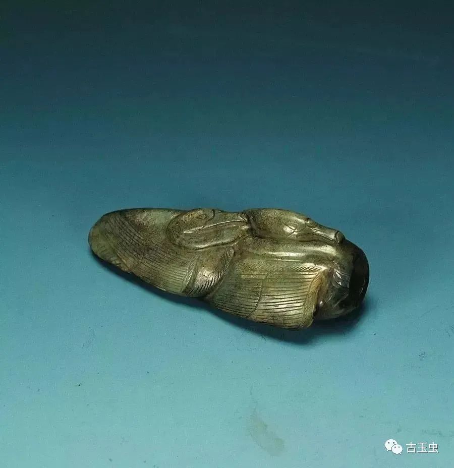 青玉质,表面大部分呈黑色,似经过火烧所致。器体呈长椭圆形,自然放置时容器呈横卧状,器口在旁侧。圆雕同向交颈并卧的双鹅,其内腔为长管形,应是盛针之用。在器口的两侧各有一孔,与内腔相通。