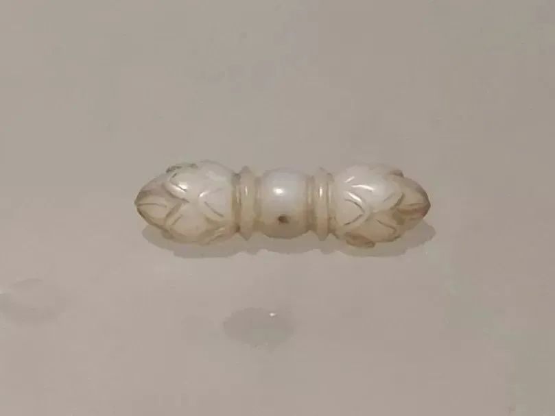 白玉质,雕成六节竹节形,最上一节为盒盖,下面五节为圆筒形盒。在盒身的下、下两节及盒盖两侧雕突出的耳,耳中为上下贯通小孔,其中穿金链。金链以双股金丝环环相套而成,下端穿缀茄形金蒂蓝色琉璃珠。此器出土时位于金塔之内,盒内贮存舍利子。