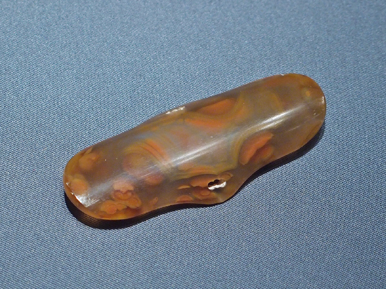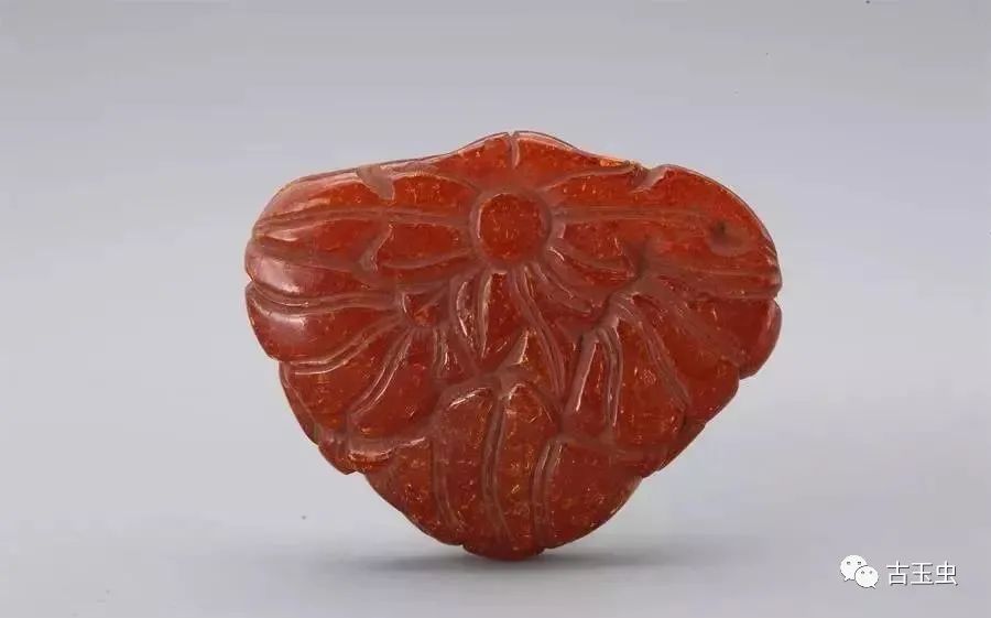 琥珀是地质历史上的树脂经过石化作用的产物,被称为“树脂化石”。具有非常美丽的典型的树脂光泽,有的是珍珠光泽,透明或半透明。质优者常用作玉雕材料,最上品称血珀,作赤红色。明代宋应星《天工开物》记载:“琥珀最贵者瑿(音依,此值黄金五倍价),红而微带黑。然昼见则黑,灯光下则红甚也”。这两件琥珀饰均以血珀雕成,质工俱佳,十分珍贵。