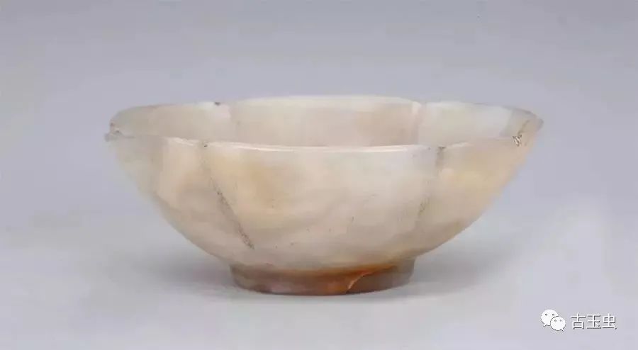 均为半透明的素色玛瑙,即玉髓质。上件为小盏,圆形敞口,圈足外撇,琢制粗率,光素无纹,出土时置于一绿玻璃方盘上。下件为六瓣花式碗,形仿瓷器,器形硕大。