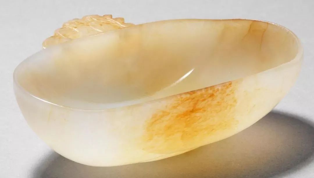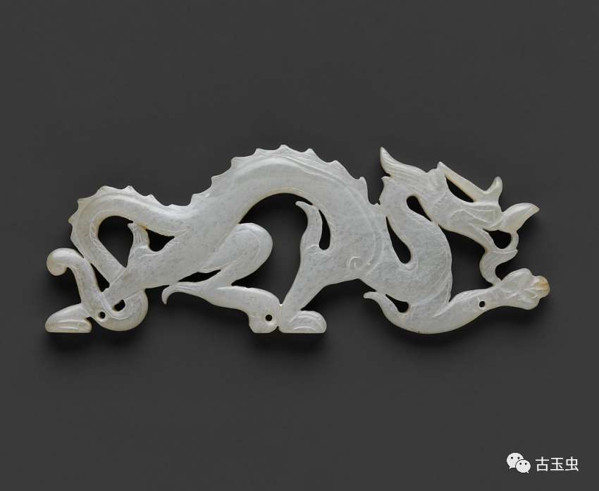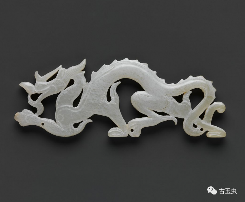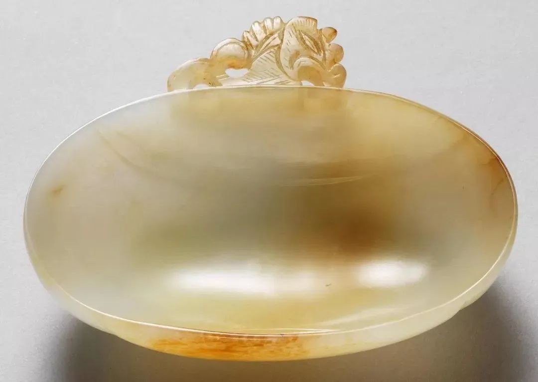 白玉质,微闪青,圆口。外壁通体浮雕两条呈行 进状态中的龙,龙身细长无鳞,皆四爪张开,呈车轮状。一侧以龙首作柄,龙张口吐舌,上下唇皆外翻。平底无足。 这种玉器造型来源于汉代 的魁,原为盛羹的器物,以单柄外向的龙首为主要形制特点。龙为最高等级的神兽,符合“魁”字中“首、大”的意义。魁最早常以陶、木为之, 两汉、魏晋时铜质魁较多,又称“龙铜魁”。玉质魁目前发现最早者为南京大学博物馆所藏的刻有辽代契丹文字的龙柄玉魁,为辽皇室用玉,器形 与此器类似,已演变为酒器。 魁这种器物主要流行于北方的汉人和少数民族中,直到元时还广泛使用。"
