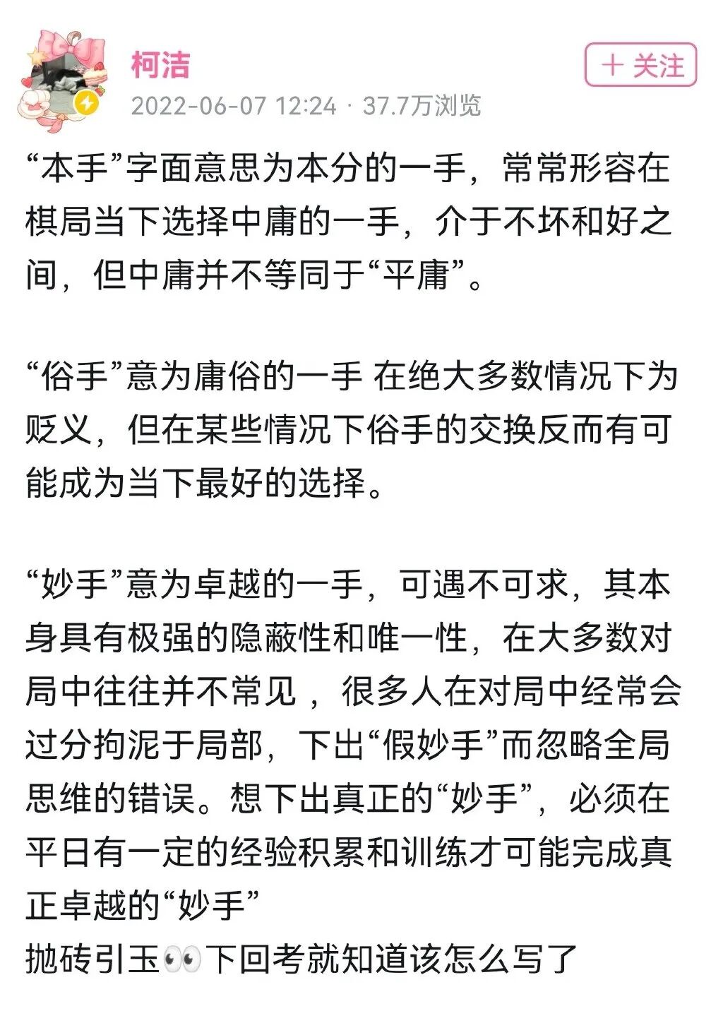 一看题目,许多人懵了,啥是本手、妙手、俗手。