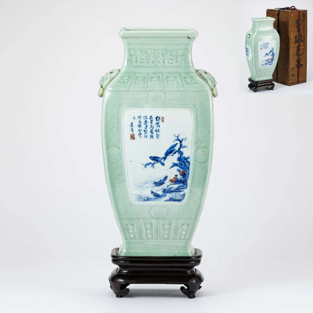 Lot 117 清乾隆 豆青釉青花釉里红花鸟纹四方瓶