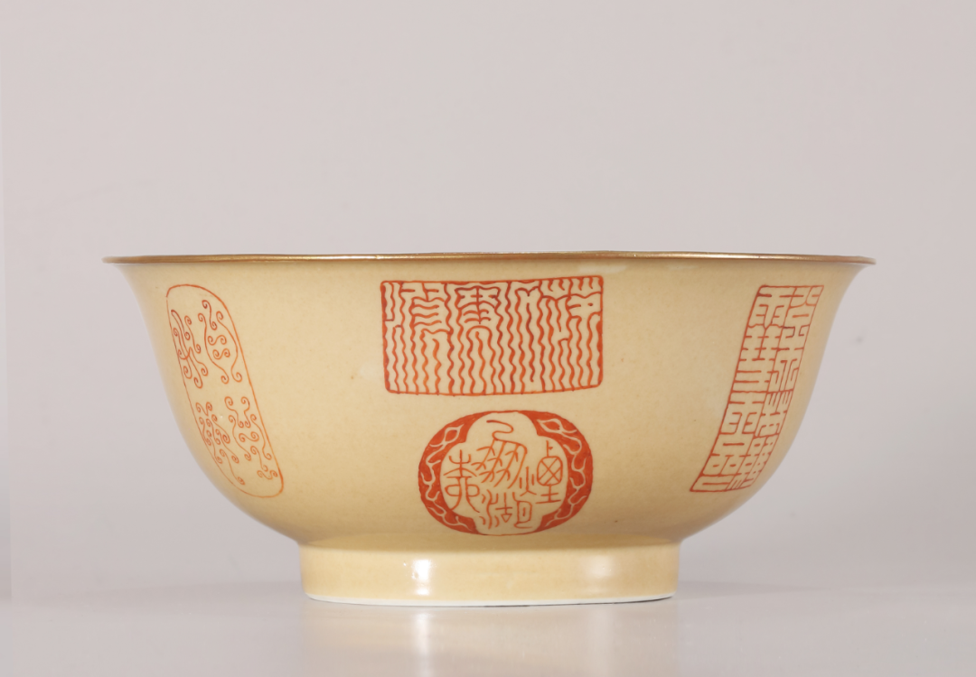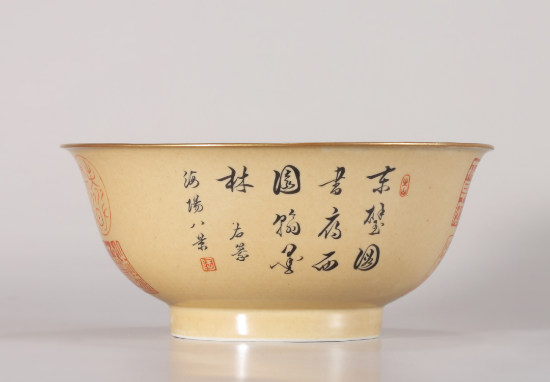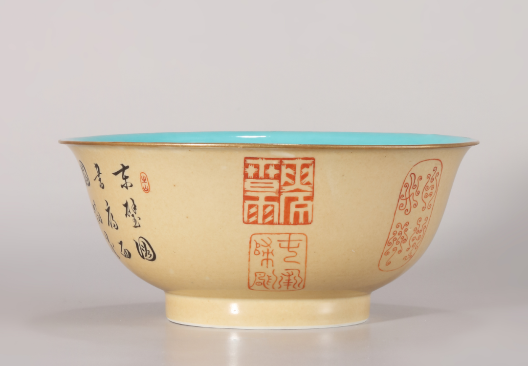清乾隆 唐英风格米色彩矾红墨彩内松石绿“海阳八景”碗