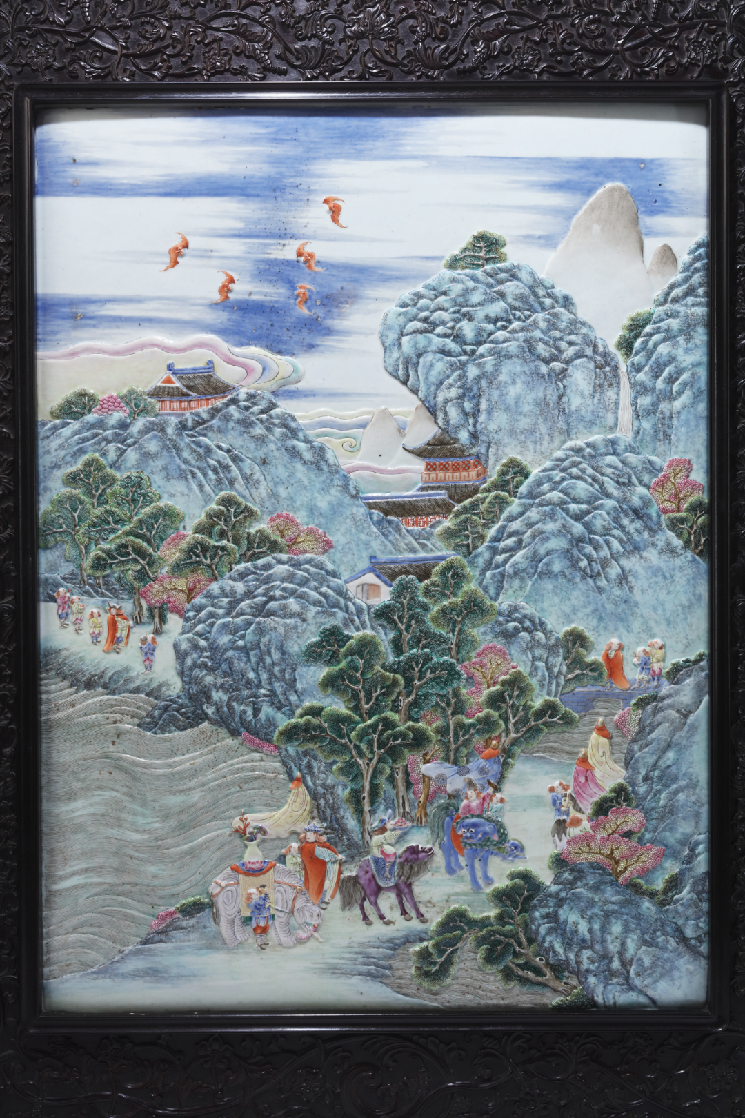 清乾隆 洋彩雕瓷“八蛮进宝”山高水长大瓷板挂屏