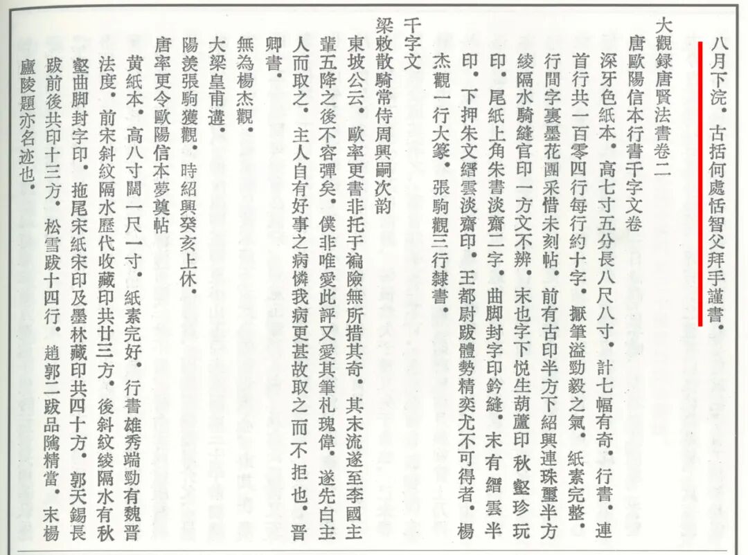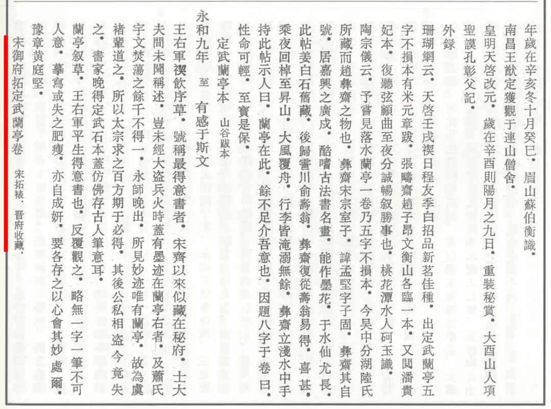 后又记《宋游丞相藏兰亭三种》:『此三种宋游丞相所藏。丞相名似,字景仁,藏兰亭凡百种。余在京师时曾见二十余种,此其三也,一摹定武,一摹褚本,一集兰亭字。每卷前后各以杂色笺装之。上有晋府大小印记,盖有明时曾入晋府者。其赵孟林印,则当时装潢款也。余所见游丞相兰亭,每卷之尾皆有题记,唯此三卷失之。而以韦奥宗所集一百五十三字本居前,两卷之间题云,前一本眉州寄居赵使君所刻,后一本带御器械韦君所刻。韦乃太府卿璞之子,显仁后家也。据此则此两卷之所以无题记,实缘互见,非关脱失。至末一集,则失题记,不可考矣。』