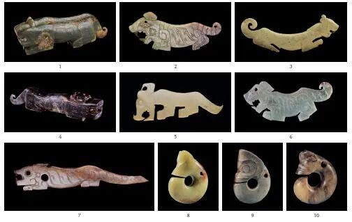 1. 妇好墓M5:409 玉虎;2. 妇好墓M5:359 玉虎;3. 谭家岭W3 玉虎;4. 妇好墓M5:405 圆雕玉虎;5. 妇好墓M5:1310 玉虎;6. 妇好墓M5:358 片状两面雕玉虎;7. 妇好墓M5:991 片状两面雕玉虎;8. 牛河梁N2Z1M4:2 兽面玦形玉器;9. 牛河梁兽面玦形玉器;10. 辽西兽面玦形玉器