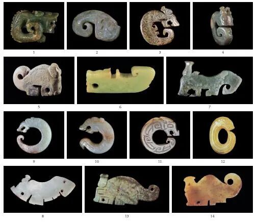 1. 妇好墓M5:408 圆雕玉龙;2. 妇好墓M5:992 圆雕玉龙;3. 妇好墓M5:422 半圆雕玉龙;4. 妇好墓M5:466 半圆雕玉龙;5. 孝民屯71AHM11:1 半圆雕玉龙;6. 宁乡黃材镇王家坟山半圆雕玉龙;7. 妇好墓M5:360 片状两面雕玉龙;8. 妇好墓M5:1118 片状两面雕玉龙;9. 妇好墓M5:424 片状两面雕玉龙;10. 妇好墓M5:369 片状两面雕玉龙;11. 妇好墓M5:995 片状两面雕玉龙;12. 殷墟86APM719:2 片状两面雕玉龙;13. 殷墟77GGM701:1片状两面雕玉龙;14. 滕州前掌大M109:4 片状两面雕玉龙