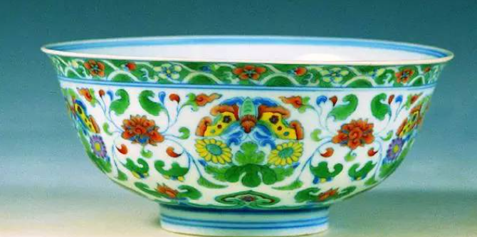 雍正年间的斗彩团花花蝶纹碗外壁腹部绘有花卉、蝴蝶、菊花等,这种形式传承于明代成化年间,同时期的淡描青花花蝶纹盘也十分的精美。