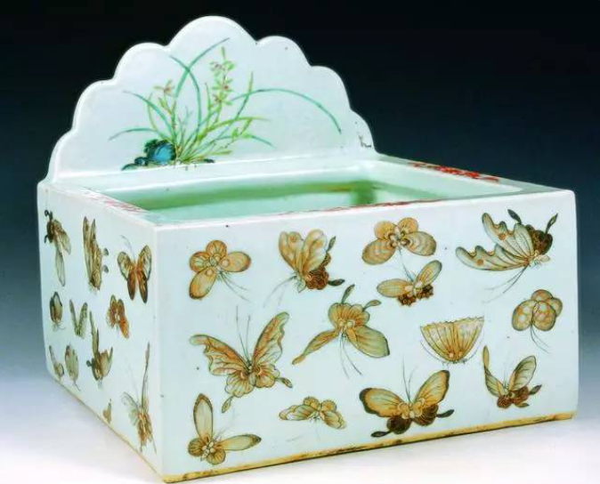 最有意思的是制作于光绪年间的粉彩描金蝴蝶纹方形纸篓,此纸篓为正方形,纸篓的三面都会有蝴蝶,每只蝴蝶形态不一,刻画细致入微,与整个器形和谐统一,是此类瓷器中的极品。