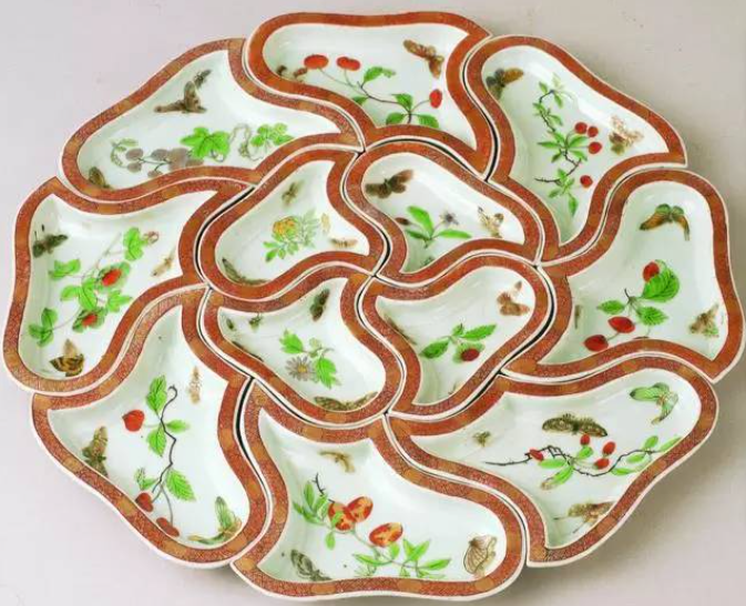 元明以后,中国的陶瓷业得到了极大的发展,蝴蝶元素作为重要的纹样被广泛的运用到瓷器之中,最为常见的就是将蝴蝶与花卉组成“蝶恋花”的样式出现,例如康熙五彩描金花蝶纹攒盘,此盘有12个小盘组成,盘内绘着不同的花卉和蝴蝶,精细华美。