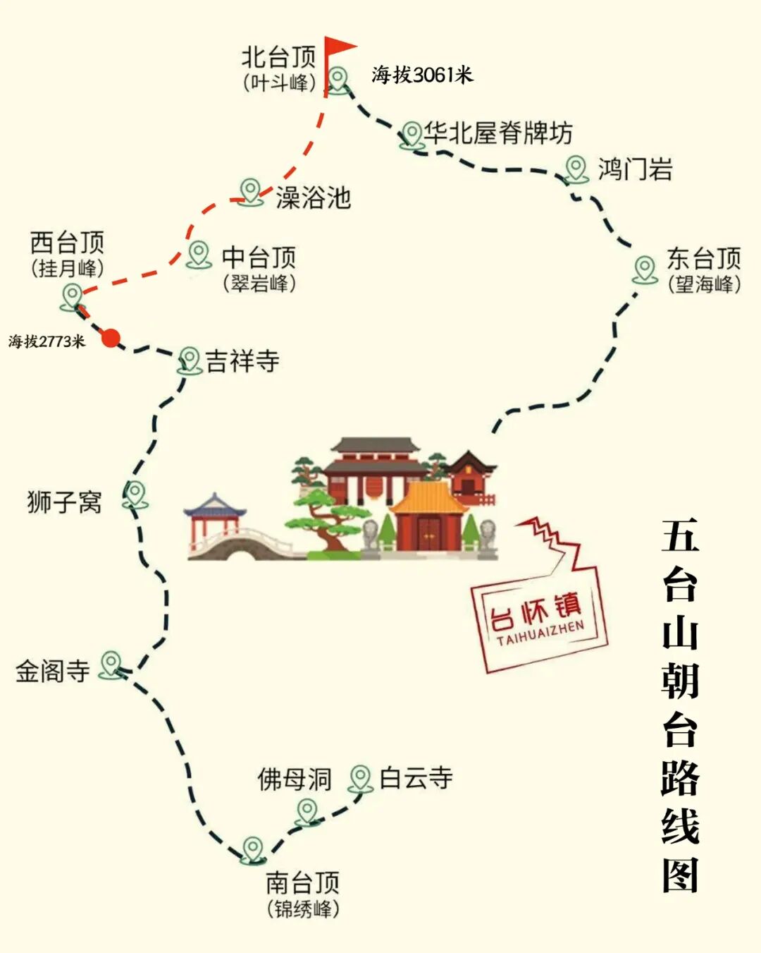 徒步路线:西台牌坊西台法雷寺(1公里)西台牌坊(1公里)中台演教寺(3公里)澡浴池(3公里)北台灵应寺(3公里),共约11公里。