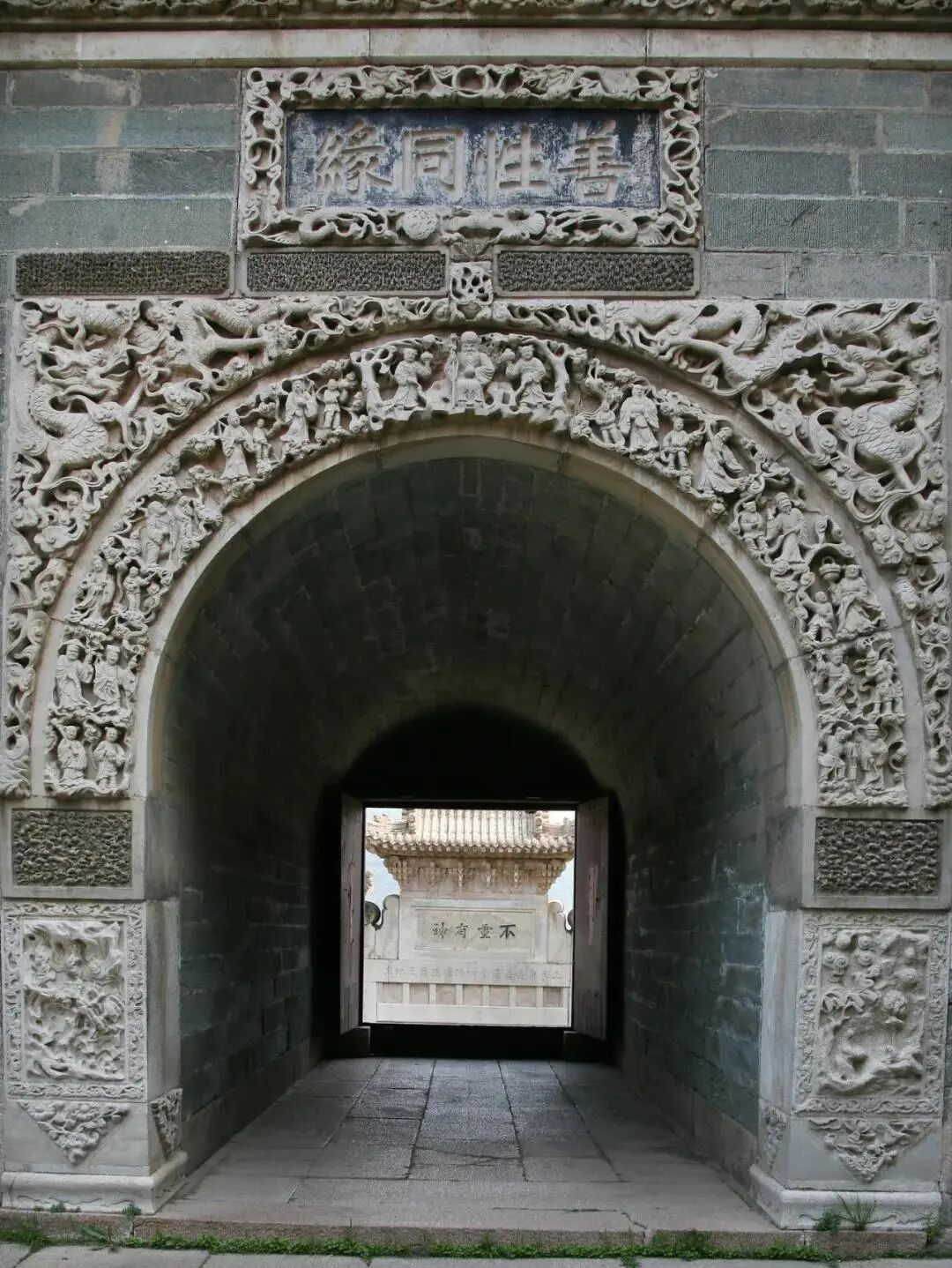 南山寺的影壁是五台山寺院最大的,石砌底座,细磨青砖筑壁身,中嵌汉白玉石雕,题词和对联雕刻其中,顶部壁檐有砖雕。