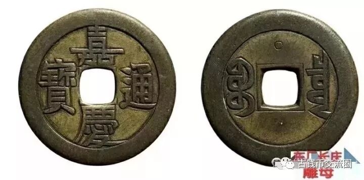 而嘉庆通宝普通品的庆字是少了那一横的,心下从“乆”。![]()