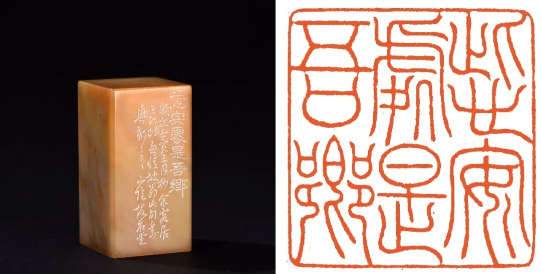 边款:此心安处是吾乡。岁次壬寅三月杪,余客居之江畔。忽忆坡翁此句,乘兴刻之,山阴鼓石堂。