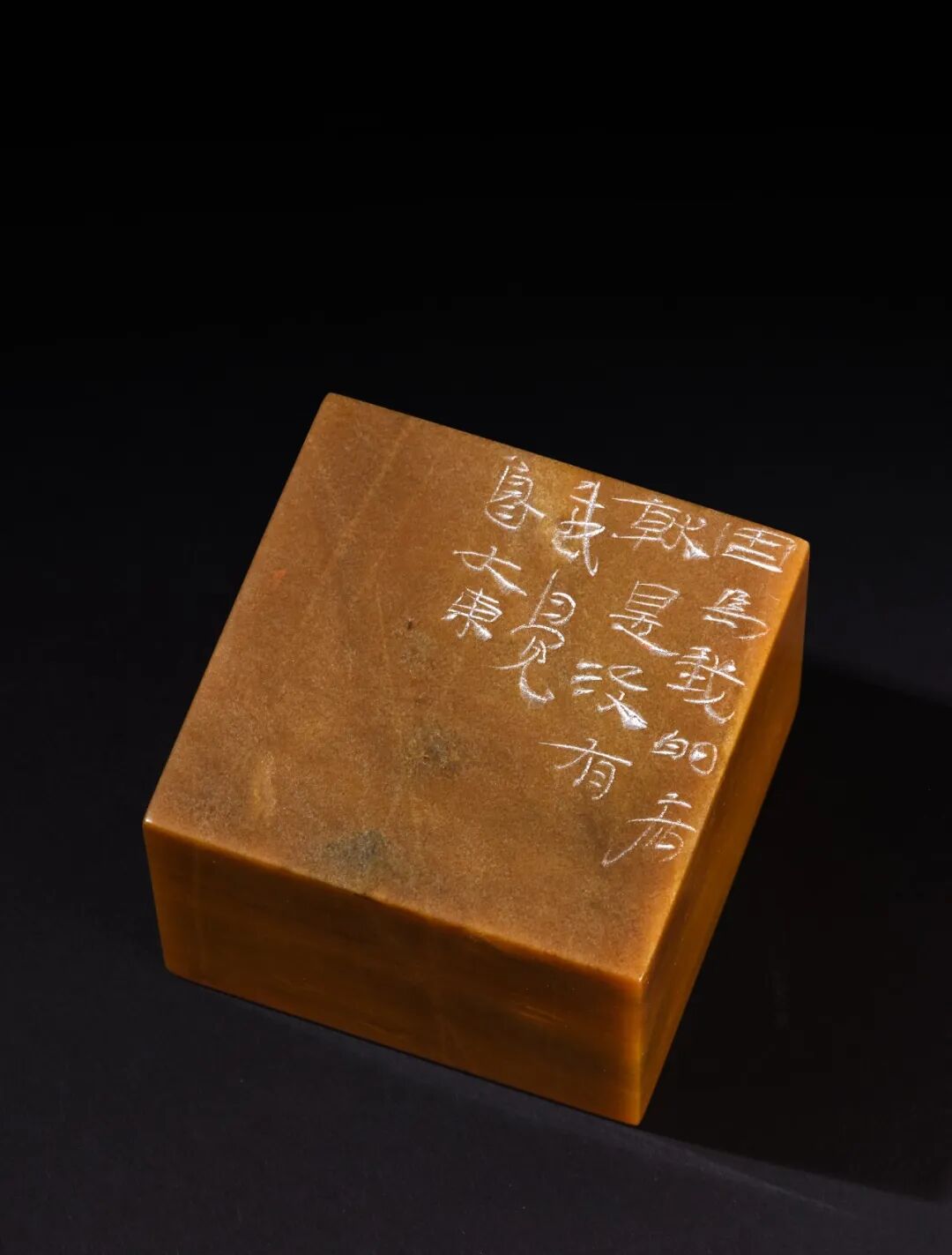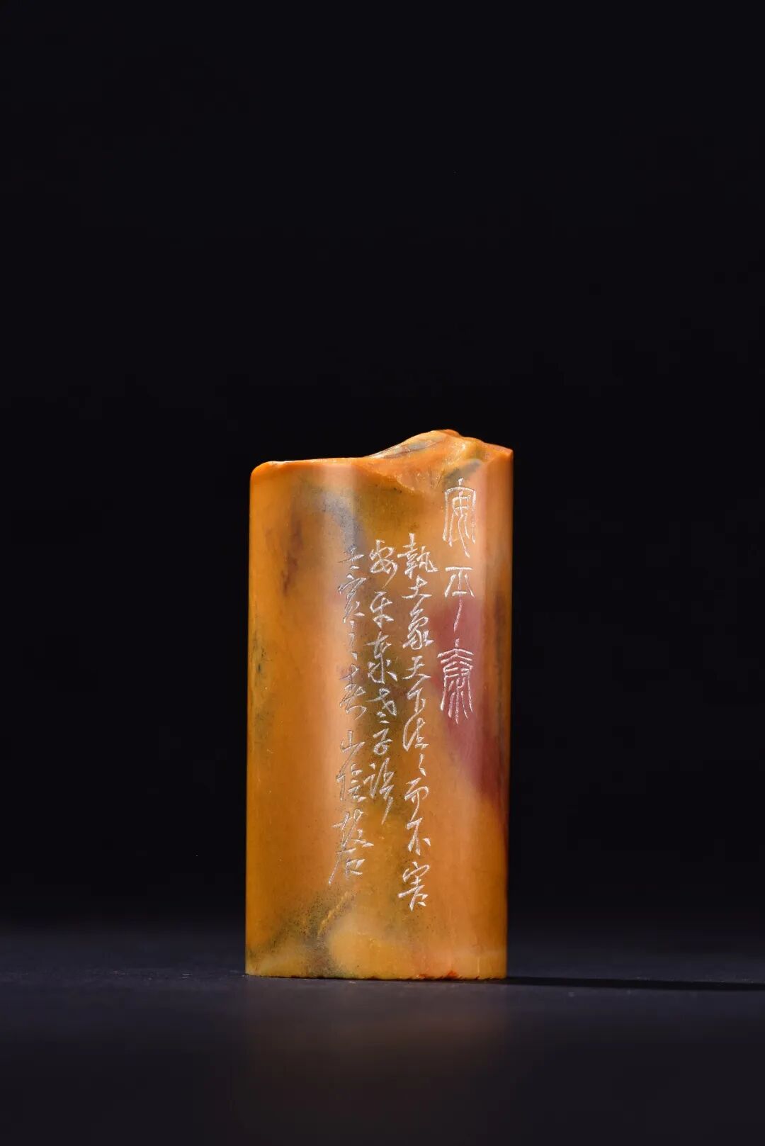此印选材一件老巴林黄花冻六面平。六面平无疑是篆刻印石中气格最高的存在,稳妥且低调,深受历代文人的喜爱,且永不过时。此为鼓石博士乔迁新居后有感之作,语出苏东坡词句,边款中有相关阐释,流动而不失典雅的一品元朱文。文字排布、线条曲直搭配极度舒适,不同于市面上一般横平竖直、毫无技术思想含量“俗化”元朱面貌,细节更见匠心。作品意境吻合作者当时心境,也符合作品主题安闲、自在的表达。实为印文、印石、印风、边款相得益彰之作,这件作品无疑是鼓石博士一直以来提倡的创作观念的最好表达。