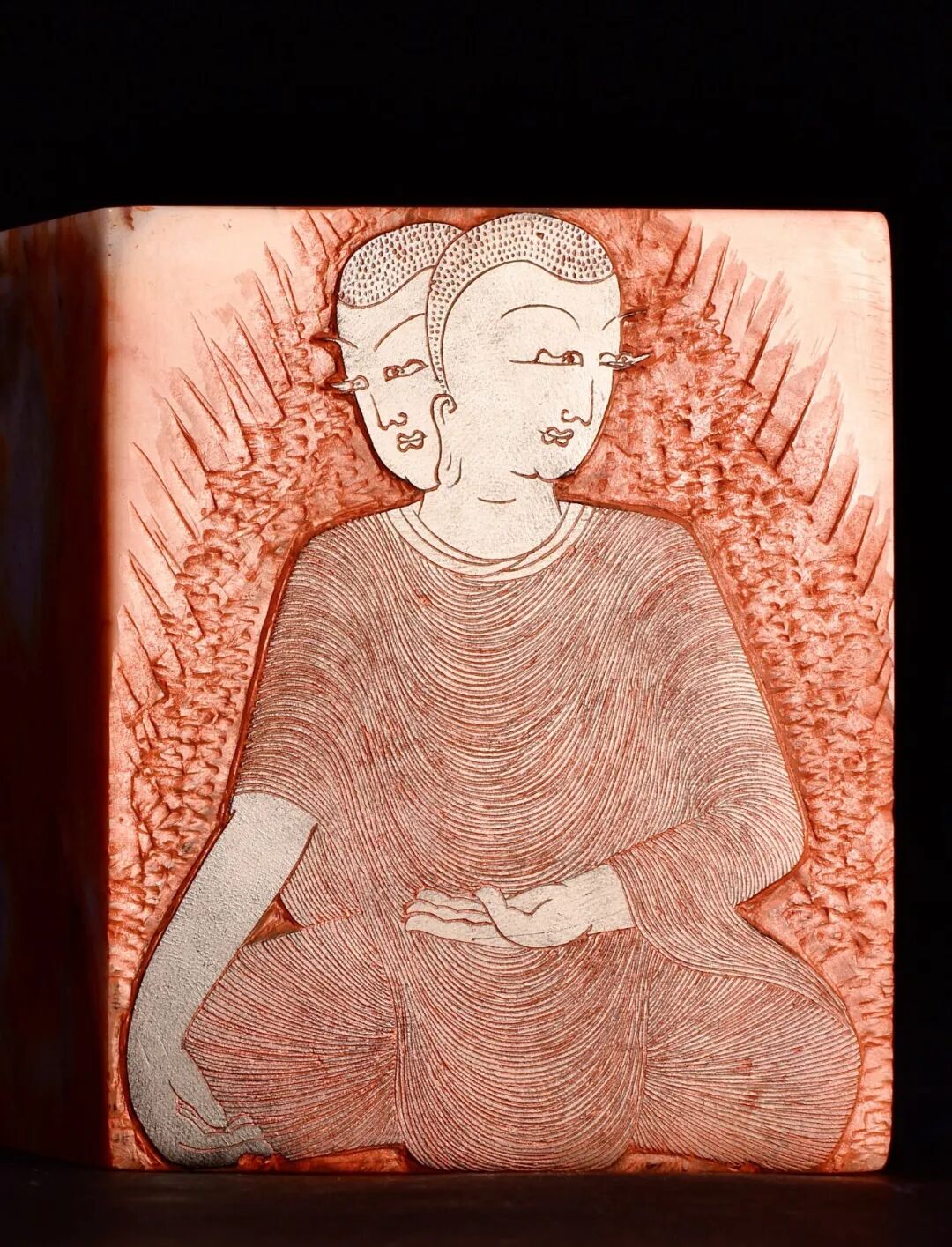 双头佛造像,双头佛在佛教典籍里罕有记载,目前唯一存世遗物是西夏时期的黑水城遗址出土文物里的一尊双头佛泥塑,现收藏于俄罗斯冬宫博物馆。此次拍品双头佛造像的创作灵感即源自于此,佛陀身着印度早期通肩式袈裟,衣质薄透多褶,体现出犍陀罗佛像艺术的高超写实手法,这种表现技艺在我国和田地区早期佛像艺也精彩体现,被誉为我国“曹衣出水”艺术的源头样式。双头面相不同,都呈慈悲相,从容安详。左手执于腹部,右手垂搭右膝,双腿结跏趺而坐。佛陀造像整体从容自然,秉承古典佛造像意趣。