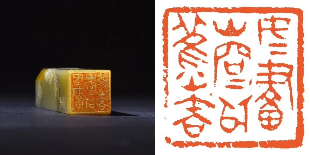 此作选用一品寿山五彩牛蛋石。牛蛋为掘性独石,高品质者不亚于田黄。鼓石博士刻粗朱文写意鸟虫“安平泰”三字,句出《老子》。鸟虫篆在近些年特别火爆,然而大部分流于花哨浮夸、装饰装饰的表达,而缺少篆刻本位的思考。鼓石此印,雄厚华滋,线条力感惊人,非一般花拳绣腿可抗衡。这种富有“金石气”的鸟虫篆,是一种高难度的结合,一方面要求作者熟谙鸟虫篆创作原理,另一方面也要求创作者有较深的“写意印”创作功力。边款以篆书和行草搭配完成,稳健和流动并存。“安平泰”,无疑是近些年普罗大众最大的希望和追求。