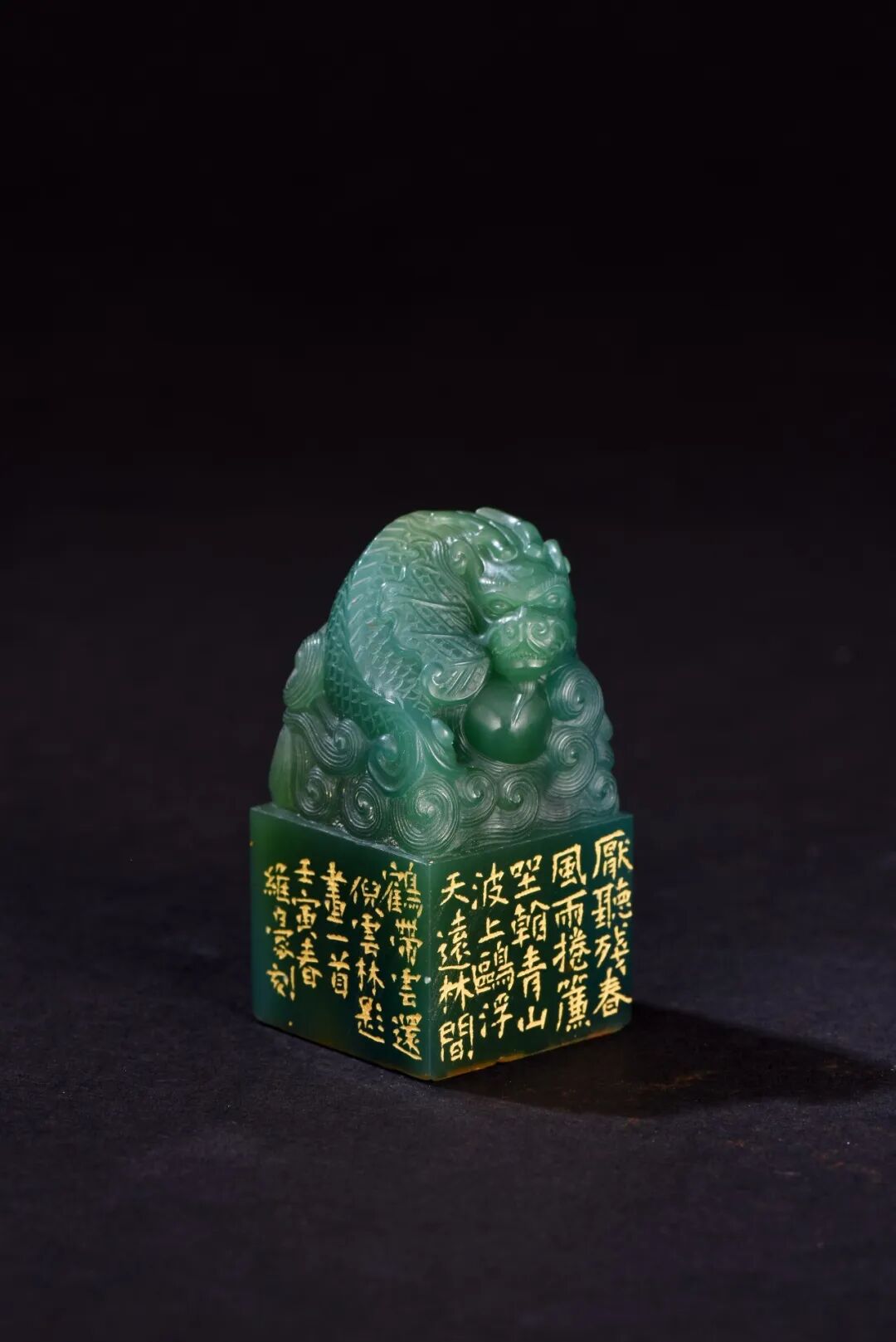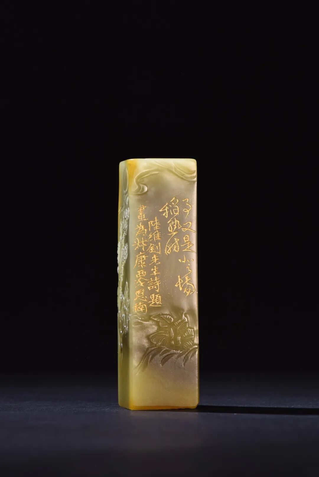陈惊雷博士一方老挝石印章“相逢意气为君饮”,语出王维《少年行》,雄伟江山与英雄豪杰的画面仿佛出现在眼前,大气恢宏,气势磅礴。印文篆刻干净利落,线条遒劲豪放,大刀阔斧;边款篆刻草书字体十分潇洒霸气,率意自然,选用一方老挝芙蓉体,雕工为陈武工作室作品,以刀代笔,刻画的十分细腻,色泽纯正细腻,舒适温润质感,薄意雕刻线条优美,活灵活现,绝美作品。