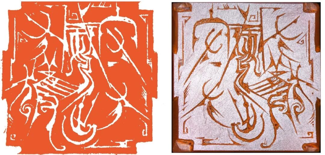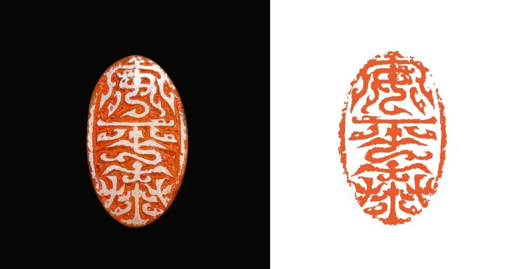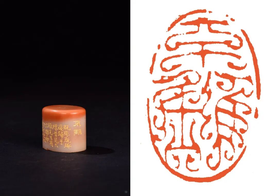 “不雕”作为一种精神追求,潘天寿先生曾在画作中钤盖过此内容印章。所谓“清水出芙蓉,天然去雕饰”,是一种人们追求大朴不雕的境界。印章在取法上,采用鸟虫的风格;在布局上,为了和石头的形式配合,鸟虫的盘曲更加灵活自由,适合随形印的章法排布,但过度的装饰意味又会容易显得工艺。因此,在整体上仍然追求一种概括与简素的审美内涵,兼顾艺术性与装饰性,达到创作者个人的自由表达。